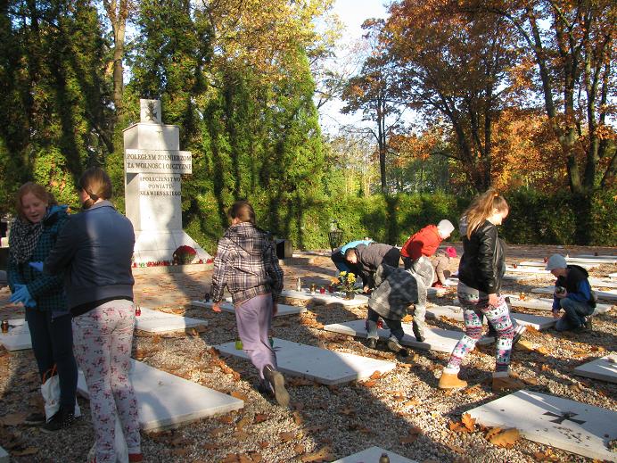 Dnia 29 października uczniowie klasy V i VI pojechali na cmentarz porządkować groby żołnierzy poległych w obronie ojczyzny. Zapalili znicze, złożyli kwiaty na Grobie Nieznanego Żołnierza. Uporządkowali zaniedbane i opuszczone groby dziecięce. Zapalili znicze na nagrobku zmarłej tragicznie starszej koleżanki z naszej szkoły.