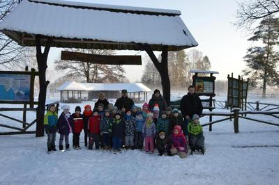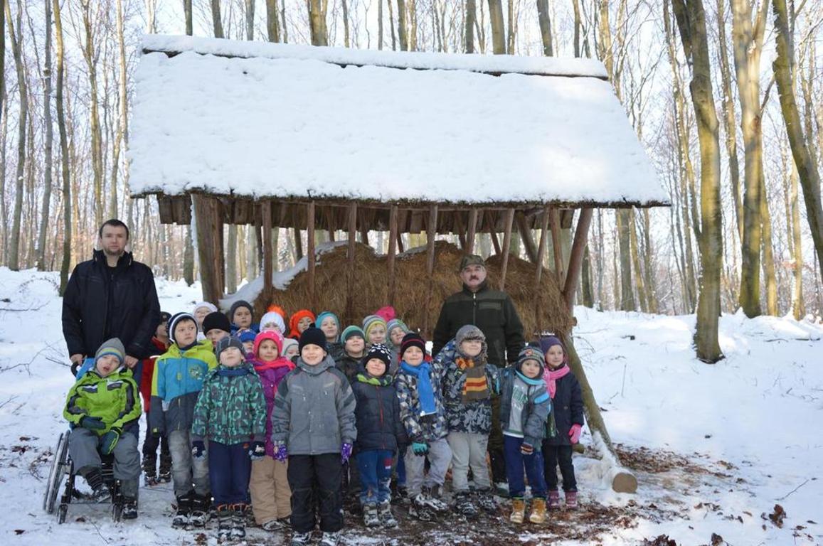 Uczniowie klasy I i oddziału przedszkolnego wybrali się do lasu na wycieczkę. Przy Zielonej szkole przywitali ich pracownicy straży leśnej. Dzięki ich gościnności dzieci obejrzały ciekawe eksponaty w leśnej chacie. Dowiedziały się, jak obliczyć wiek drzew. Zimowy las wyglądał pięknie. Leśnicy pokazali tropy zwierząt i miejsce ich dokarmiania. Dzieci zostawiły przy paśniku smaczne ,,prezenty” (ziemniaki, marchew, kapustę, ziarna zbóż) dla leśnych mieszkańców.