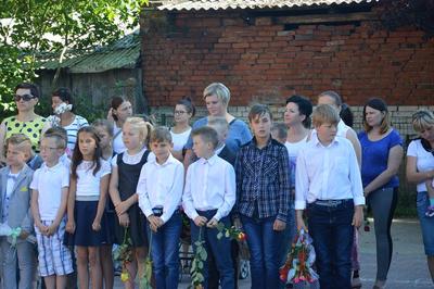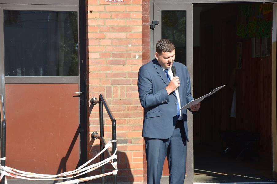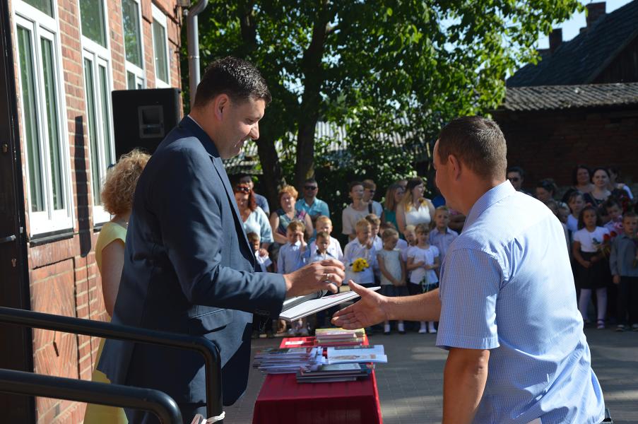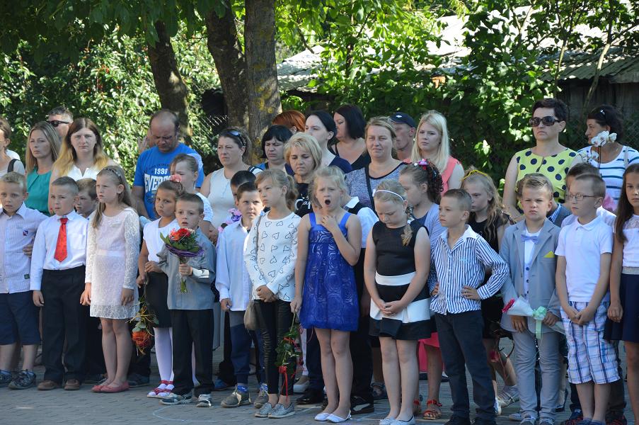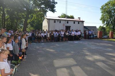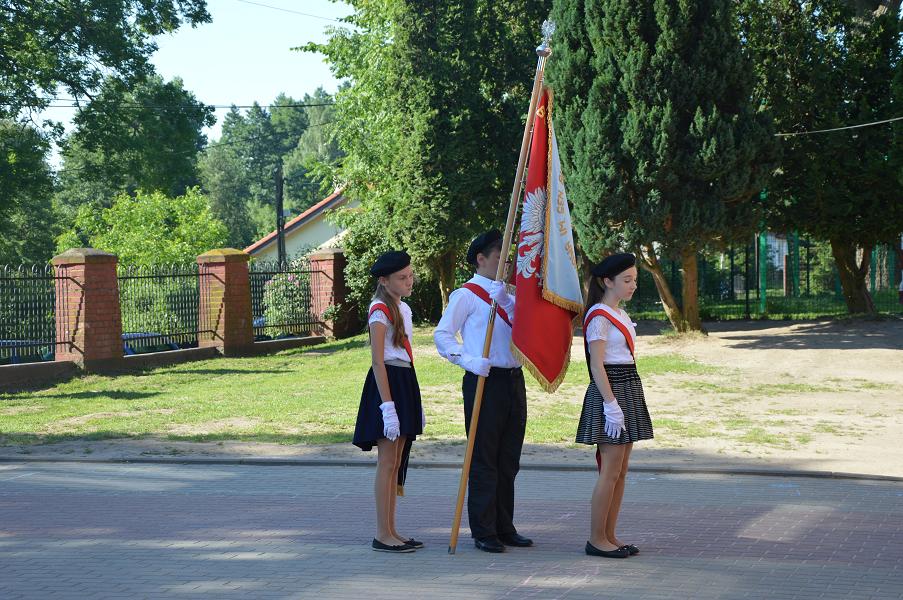 W piątkowy ranek 24 czerwca zadzwonił, po raz ostatni w roku szkolnym 2015/2016, dzwonek. Tym razem uczniowie nie od razu udali się do swoich klas. Zgromadzili się przed szkołą, by wspólnie z rodzicami i najbliższymi uczestniczyć w uroczystości zakończenia roku szkolnego. W uroczystości udział wziął zastępca wójta Gminy Sławno pan Artur Ciróg.