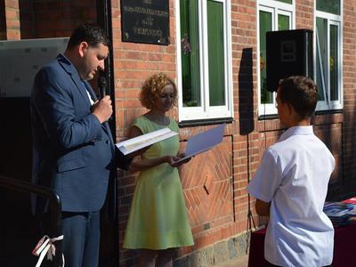 Uczniowie otrzymujący nagrody książkowe za wysokie osiągnięcia w nauce: