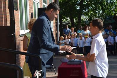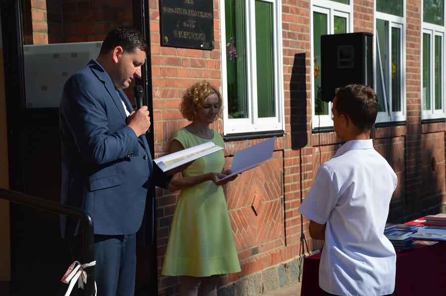 Pan Artur Ciróg wręczył uczniowi klasy VI Jarosławowi Poborskiemu nagrodę Wójta Gminy Sławno.