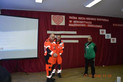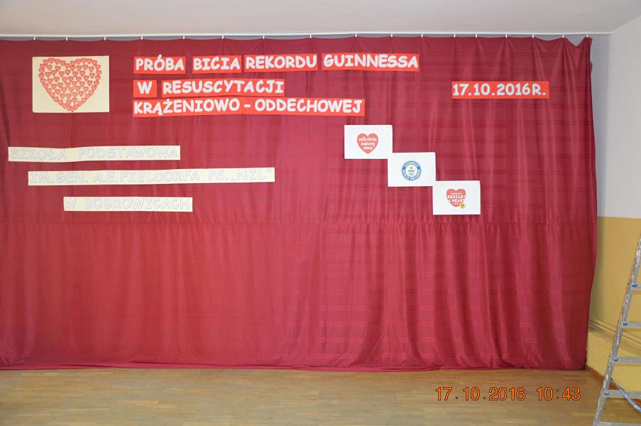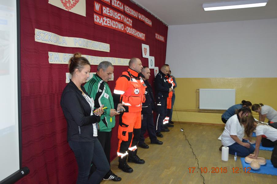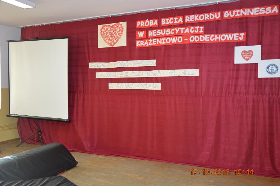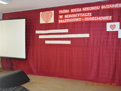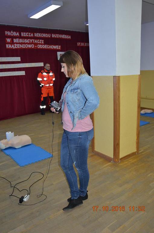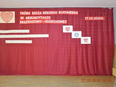Dzień 17 października 2016r. był wyjątkowym dniem dla uczniów naszej szkoły. Tego dnia uczniowie, podobnie jak ponad 85 000 innych osób, wzięli udział w akcji bicia rekordu Guinness World Records w jednoczesnej resuscytacji krążeniowo-oddechowej prowadzonej przez jak największą ilość osób. Akcję po raz czwarty zorganizowała Fundacja WOŚP, w ramach realizacji Programu Edukacyjnego ,,Ratujemy i Uczymy Ratować", który w naszej szkole realizowany jest od kilku lat. Dzień wcześniej obchodzony był Europejski Dzień Przywracania Czynności Serca, stąd data bicia rekordu.