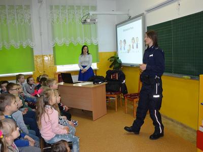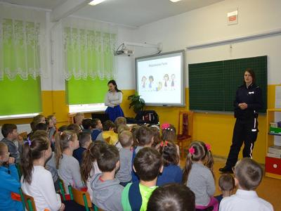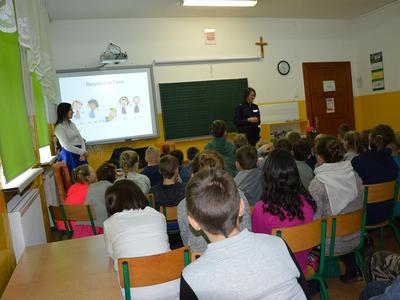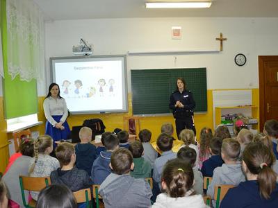 09. 02.2017r. w ramach współpracy z Komendą Powiatową Policji w Sławnie sierż. Agnieszka Łukaszek przeprowadziła rozmowę z uczniami na temat ,,Bezpiecznme ferie zimowe 2017". Celem spotkania było zwrócenie uwagi na miejsca niebezpieczne do zabaw, np. zamarznięte zbiorniki wodne, górki w pobliżu ulicy czy tory kolejowe.