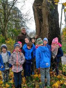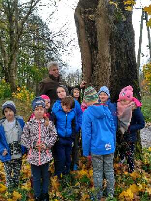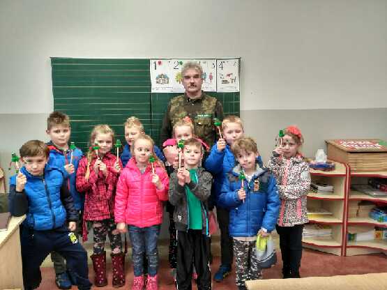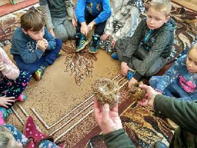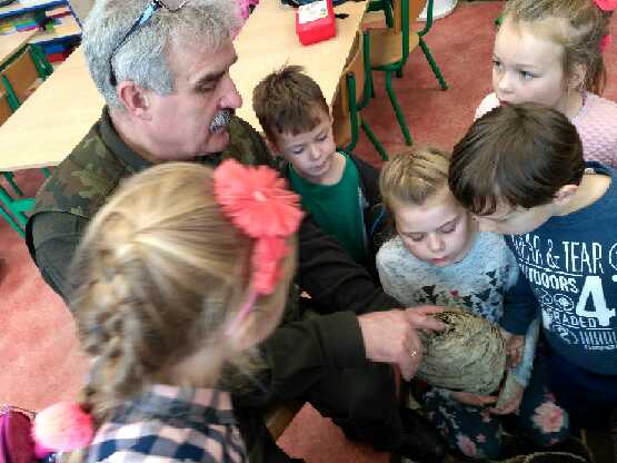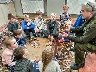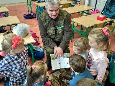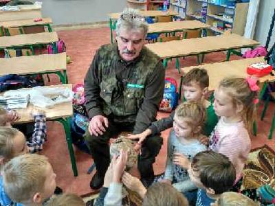 Pierwszoklasiści byli na wycieczce z leśnikiem. Obserwowali zmiany zachodzące w przyrodzie jesienią, wsłuchiwali się w odgłosy otoczenia. Przed wyjściem leśnik pokazał dzieciom okazy gniazd małych ptaków i os. Rozmawiał z pierwszakami o tym, jakie domy mają zwierzęta. Dlatego dzieci z łatwością dostrzegły dziuple na drzewach, gniazda i inne przyrodnicze ciekawostki.