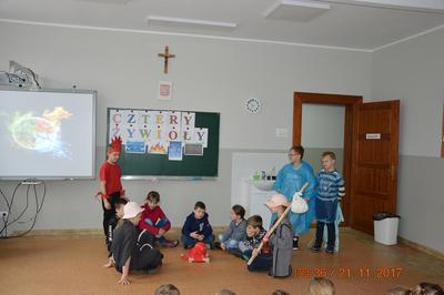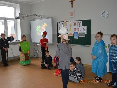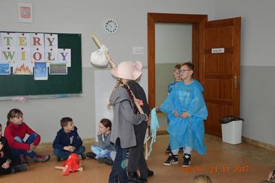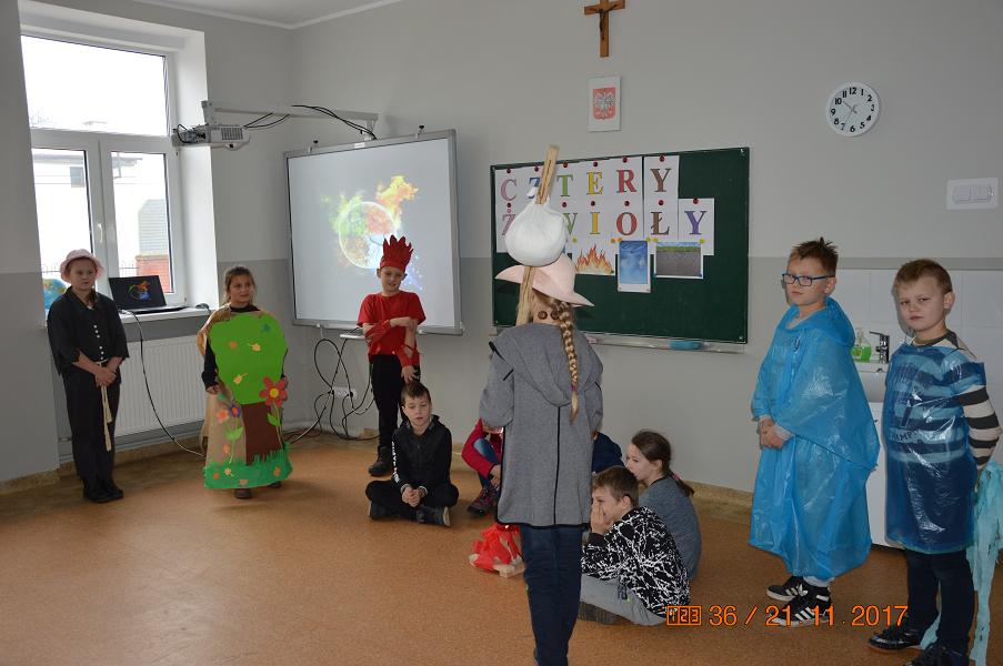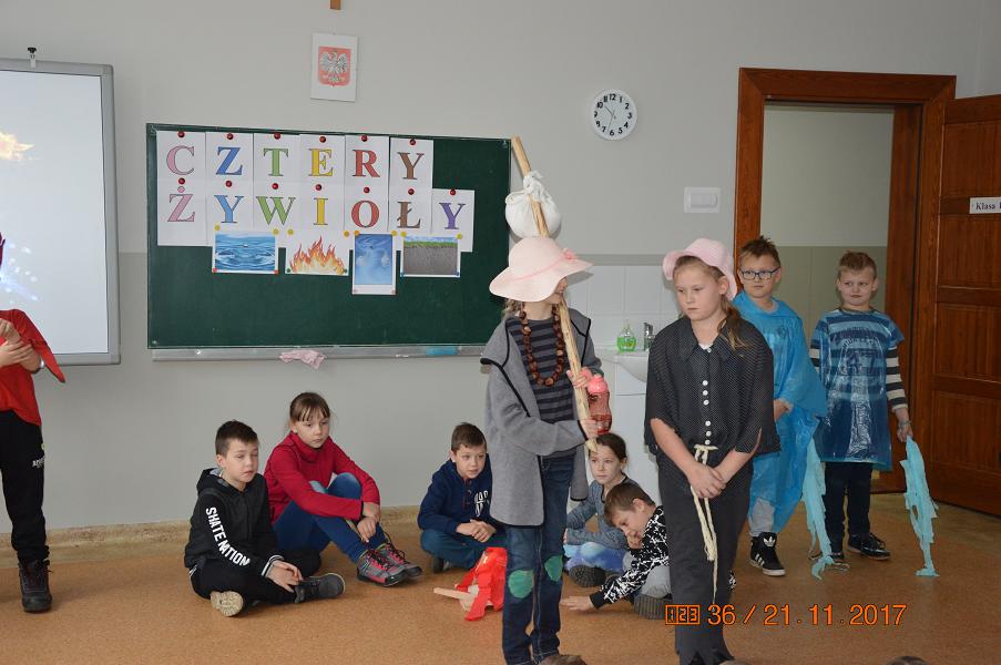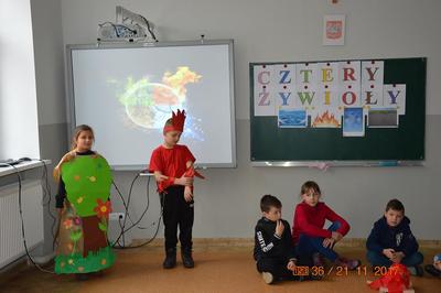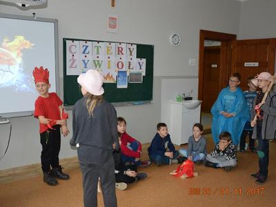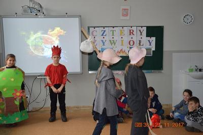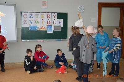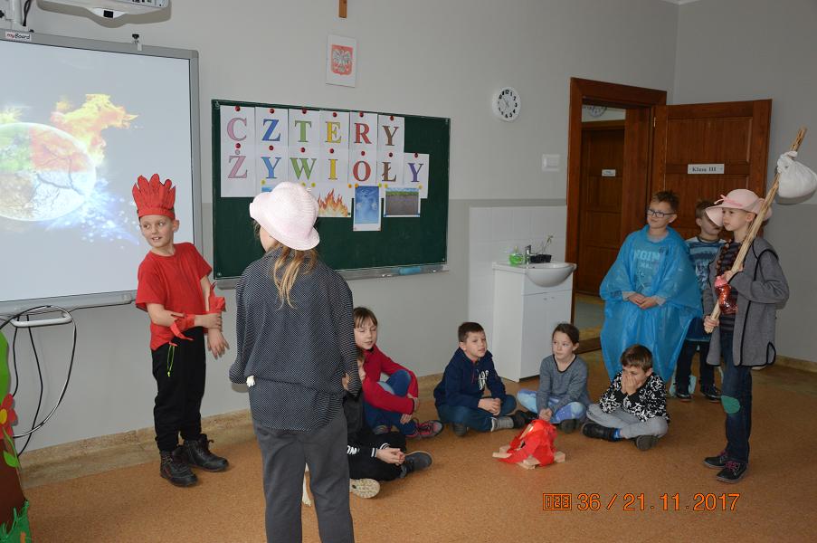 Uczniowie klasy III wystawili przedstawienie na podstawie inscenizacji Agnieszki Frączek pt. ,,Cztery żywioły”. Przygotowując się do występu dzieci poznały proces przygotowania spektaklu – od przydziału ról, przygotowania scenografii i kostiumów, aż do próby generalnej. Na premierę uczniowie zaprosili swojego klasowego kolegę Maksa, dzieci z oddziału przedszkolnego i uczniów klasy I oraz rodziców i panią dyrektor. Przed występem dzieciom udzieliła się trema, która jednak szybko minęła. Przedstawienie się udało, o czym świadczą gromkie brawa, które otrzymali mali aktorzy.