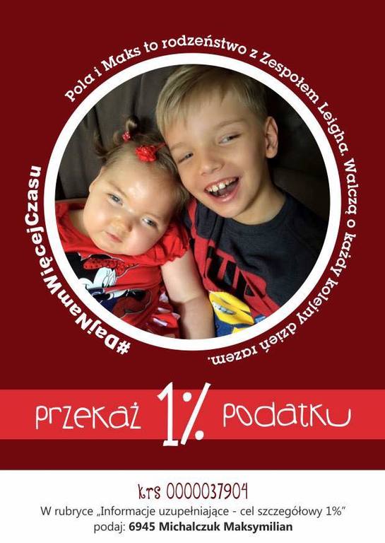 Zachęcamy Państwa do przekazania 1% podatku dochodowego za rok 2017 na leczenie i rehabilitację ucznia naszej szkoły Maksa oraz jego siostry Poli. Dzieci są rodzeństwem z Zespołem Leigha – nieuleczalną, postępującą chorobą. Maks uczęszcza do klasy III i ze względu na stan zdrowia objęty jest nauczaniem w domu. Dzieci muszą być odpowiednio leczone oraz poddawane kosztownej rehabilitacji.