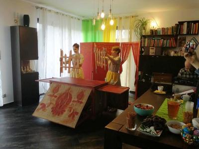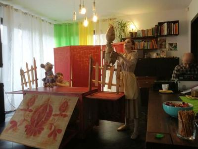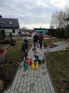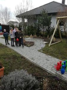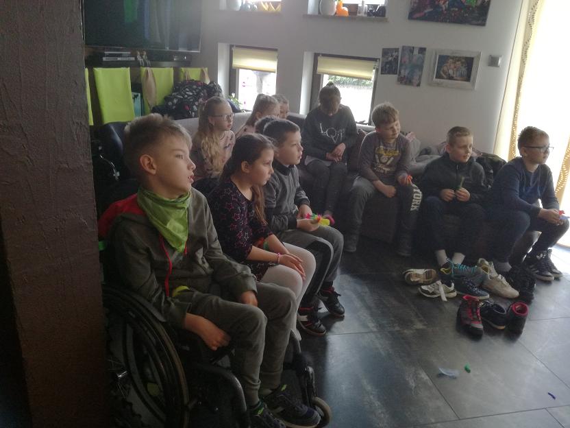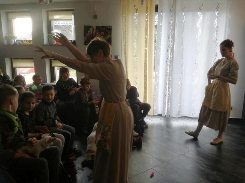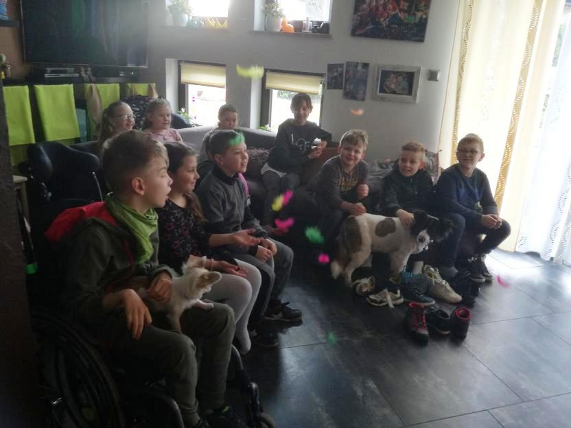 Na miejscu powitała nas pani Małgorzata – mama Maksa. Mogliśmy pospacerować po ogrodzie i przyjrzeć się pierwszym oznakom wiosny – kwitnącym krokusom. Kiedy weszliśmy do domu, czekała nas kolejna niespodzianka. Okazała się, że gośćmi Maksa są aktorzy Teatru Władca Lalek ze Słupska. Rozpoczęło się przedstawienie, które opowiadało historię małego kurczaczka i jego mamy, a także przebiegłego lisa i małej myszki. Bardzo nam się podobało, nagrodziliśmy aktorów brawami i zrobiliśmy sobie pamiątkowe zdjęcie. Potem pani Małgosia zaprosiła nas na smakowitą ucztę, czyli na pieczone nad ogniskiem kiełbaski. Zostaliśmy poczęstowani również słodyczami i napojami. Następnie przyszedł czas na pożegnanie się z Maksem.