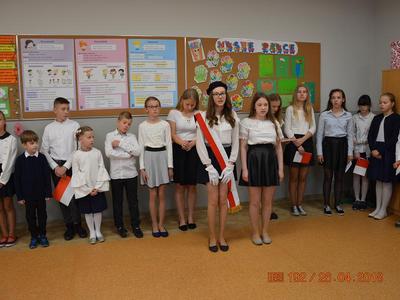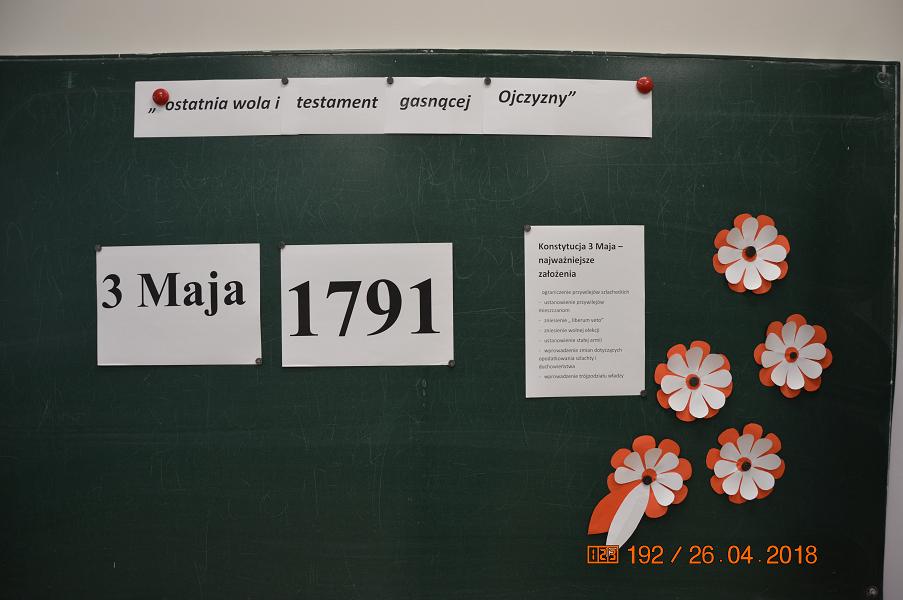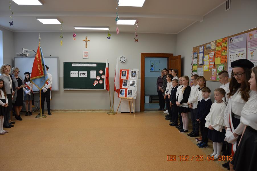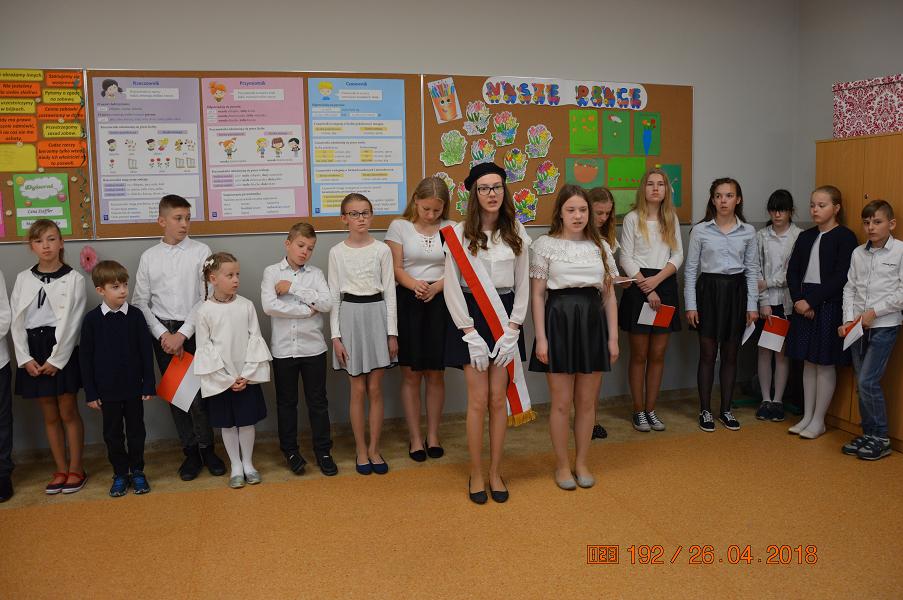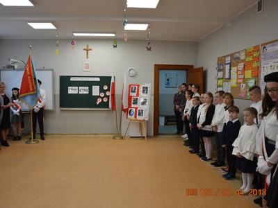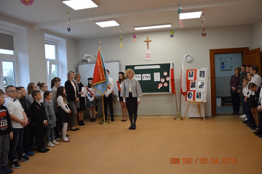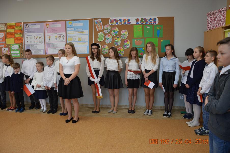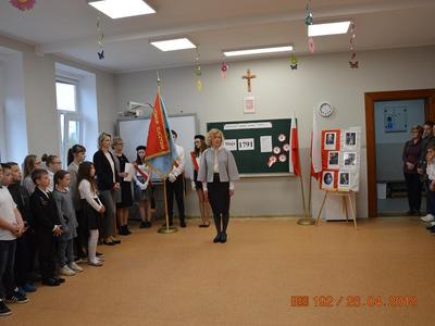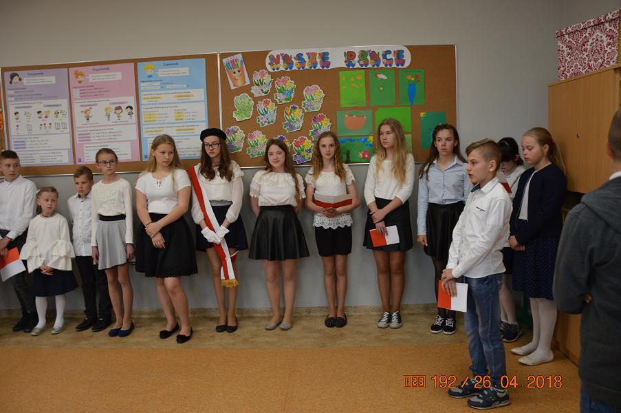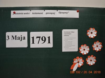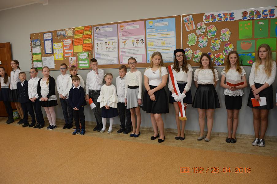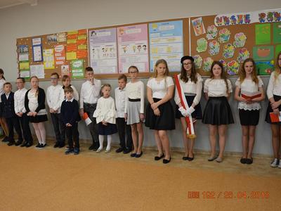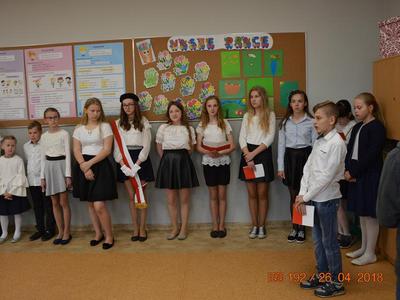 Podczas uroczystego apelu z okazji Uchwalenia Konstytucji 3 Maja uczniowie naszej szkoły przedstawili ważne wydarzenia z historii Polski w tym jakże trudnym czasie dla wszystkich Polaków. Swoją miłość do Ojczyzny oraz przywiązanie do wszystkiego co z Nią związane, wyrazili w wierszach i piosenkach patriotycznych.