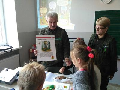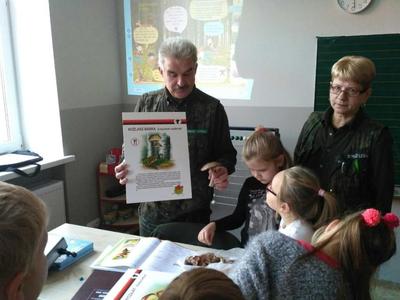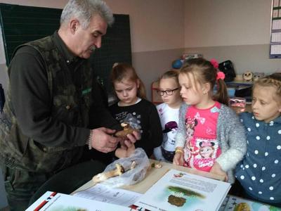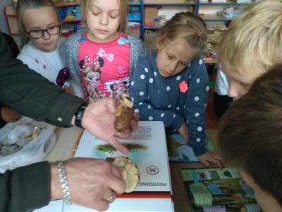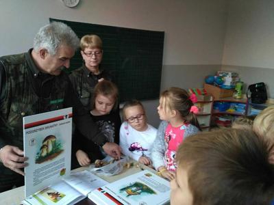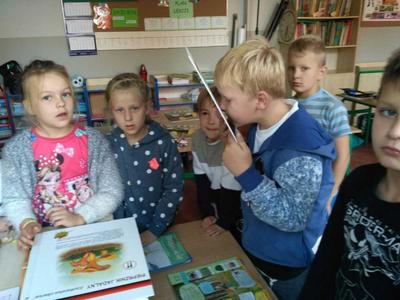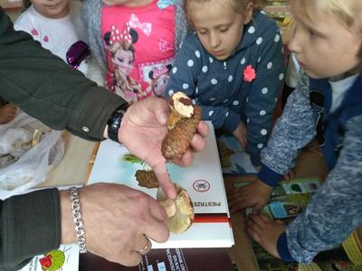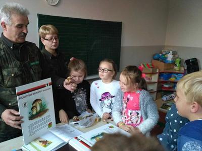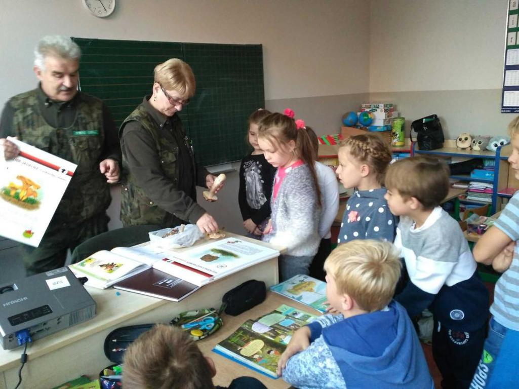 Jak należy zachowywać się w lesie? Jak zbudowane są grzyby? Na te i inne pytania na lekcji przyrody odpowiadali uczniowie z klasy II z pomocą zaprzyjaźnionych leśników: pana Bogdana Figury i pani Jolanty Firlej. Ciekawostką zajęć, oprócz okazów grzybów, były tablice demonstracyjne pachnące grzybami.