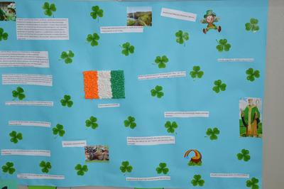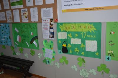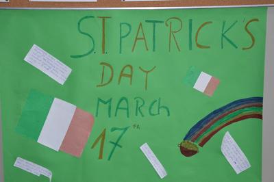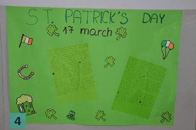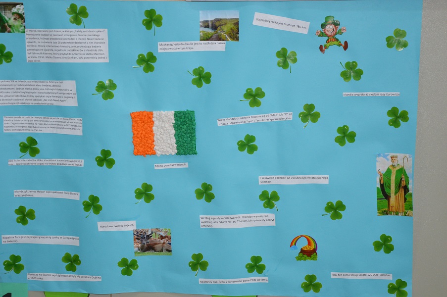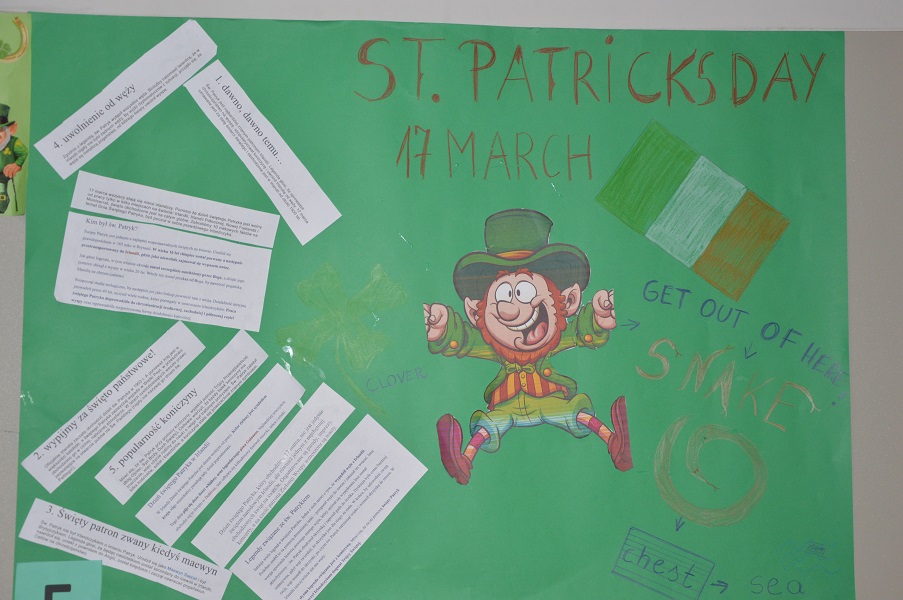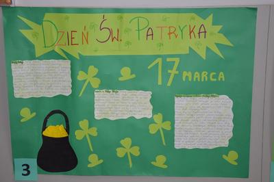 Dnia 15 marca w naszej szkole obchodzono Dzień Świętego Patryka. Z okazji tej uroczystości uczniowie mogli wykazać się zdolnościami plastycznymi. Tego dnia zostały przeprowadzone konkursy na najładniejszą koniczynkę, klasowy konkurs na najlepszy plakat o Irlandii oraz szkolny konkurs na najładniej wykonany plakat o Dniu Św. Patryka.