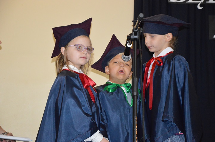 Nie obyło się również bez drobnych upominków i dyplomów. Ślubowanie uczniów klas pierwszych to bardzo ważne wydarzenie nie tylko dla najmłodszych, ale również dla ich rodziców, dziadków, bliskich. Pięknie zaśpiewane piosenki, z przejęciem wyrecytowane wiersze, wycisnęły niejedną łezkę z oczu bliskich. Ten dzień na długo pozostanie w pamięci nas wszystkich. Wielką niespodzianką tej uroczystości był taniec wykonany przez uczniów klasy pierwszej do utworu „Macarena”, który porwał do tańca wszystkich zgromadzonych na widowni. Na zakończenie uroczystości rodzice przygotowali słodki poczęstunek.