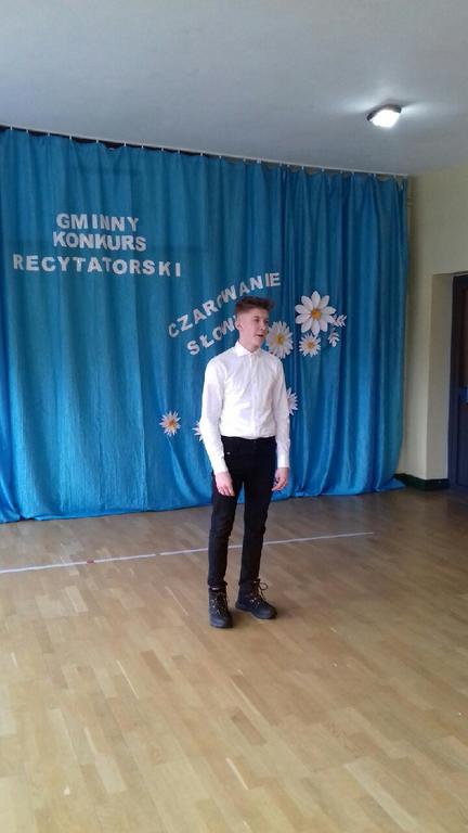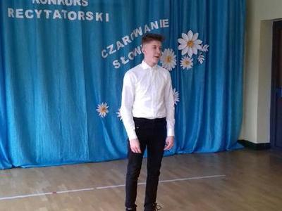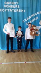 Pięknie się zareprezentowali nasi uczniowie w Gminnym Konkursie Recytatorskim, który odbył się 27 lutego w Szkole Podstawowej w Warszkowie. Cyprian Gancarz z klasy III miejsce zajął, Dominik Krawczyk z klasy VI zajął I miejsce, a Tristan Pobiehuszko z klasy VIII wrócił z wyróżnieniem.
