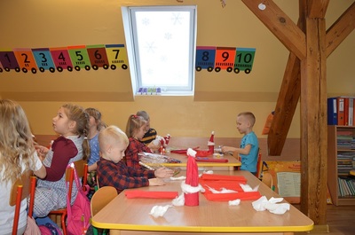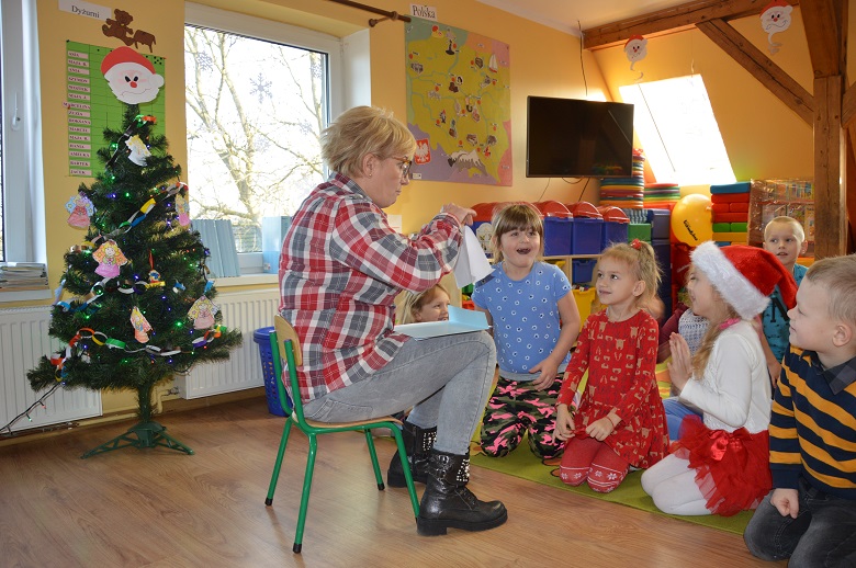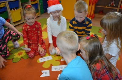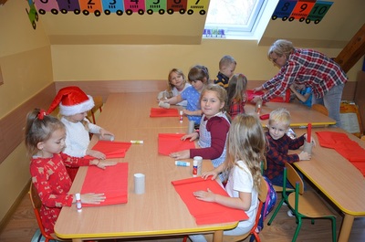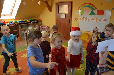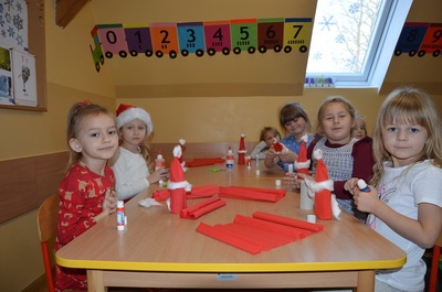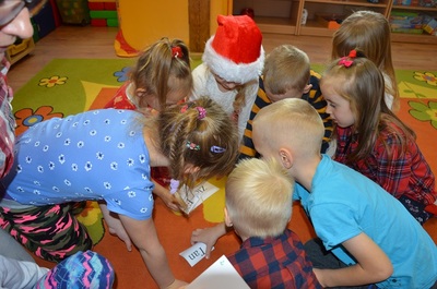 Zostawił nam list i mnóstwo zadań do wykonania, między innymi musieliśmy ułożyć imiona reniferów Świętego Mikołaja, zaśpiewać piosenki o Mikołaju, wykonać bibułkowego Mikołaja. Wszystkie zadania wykonywaliśmy z wielką radością i z błyskiem w oku.