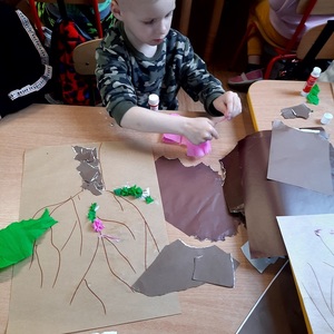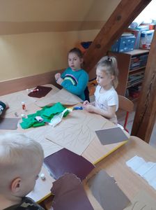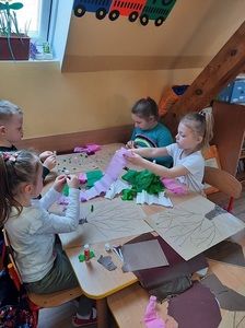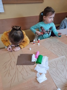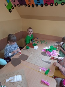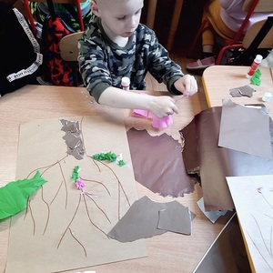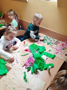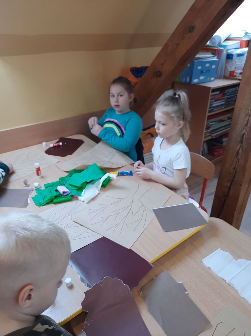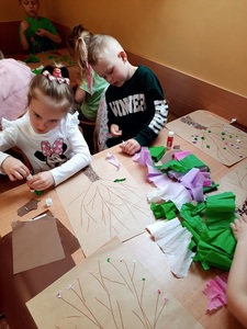 Po wysłuchaniu opowiadania A. Widzowskiej .. Przyjaciel przyrody " i rozwiązaniu zagadek, dzieci wykonały prace plastyczną - wyklejanka z bibuły ,, Drzewo"