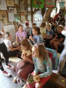 W ostatnim tygodniu roku szkolnego 2020/2021 uczniowie klas III – VII wybrali się na lekcję o tematyce pszczelarskiej do Pasieki ,,Wędrowna Barć” w Krzemienicy. Uczniowie dowiedzieli się o życiu pszczół i pracy w pasiece, konieczności ochrony przyrody, poznali produkty pszczele i ich walory zdrowotne, mieli okazję zobaczyć rodzinę pszczelą w szklanym ulu obserwacyjnym oraz zdegustować pyszny miód. Wycieczka została zorganizowana jako Warsztaty edukacyjne ,,Pszczoły i inne owady zapylające" - znaczenie dla przyrody i człowieka, w ramach projektu dofinansowanego przez Wojewódzki Fundusz Ochrony Środowiska i Gospodarki Wodnej w Szczecinie, realizowanego przez Gminę Sławno.