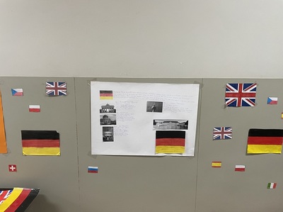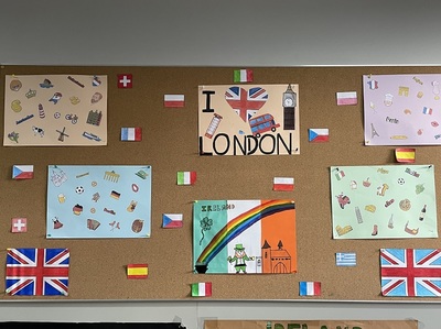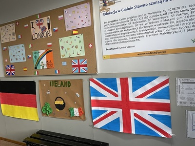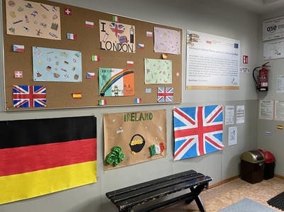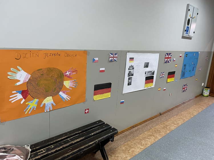 Uczniowie klasy VII I VIII stworzyli gazetkę ścienną oraz przyozdobili korytarze szkoły plakatami i flagami państw europejskich.