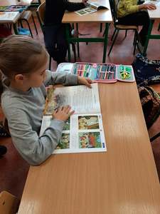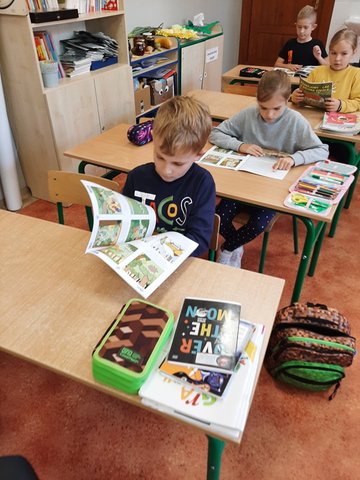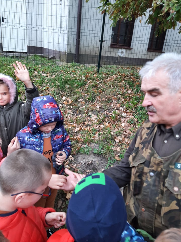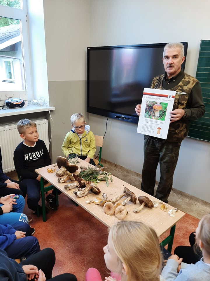 W klasie drugiej odbywają się lekcje z leśnikiem. Uczniowie uczyli się rozpoznawać grzyby, przypomnieli zasady dobrego grzybiarza. Na kolejnej lekcji uczyli się rozpoznawać w okolicy drzewa i ich liście. Wiedzą już, które drzewo iglaste gubi igły na zimę. Uczniowie otrzymali od pana leśnika książeczki o lesie. Przed drugoklasistami jeszcze wiele takich lekcji.