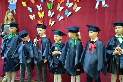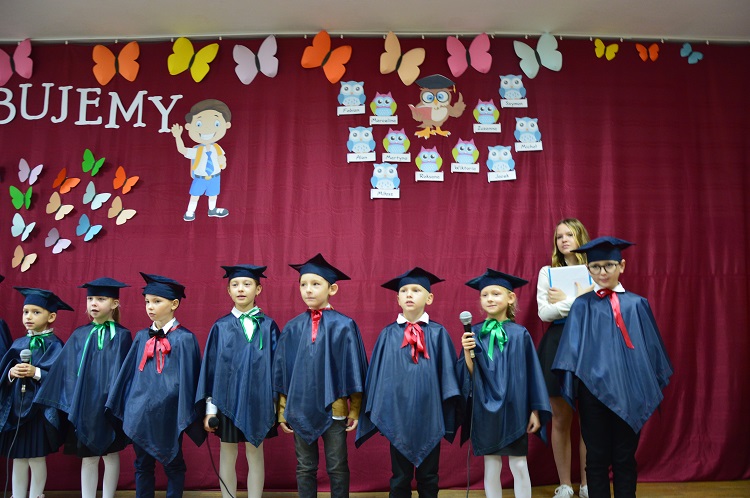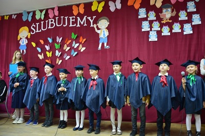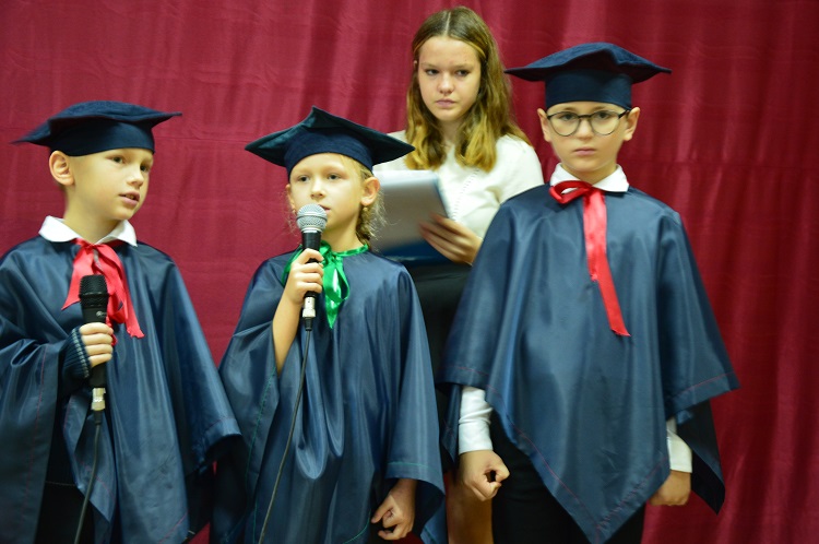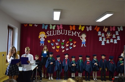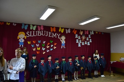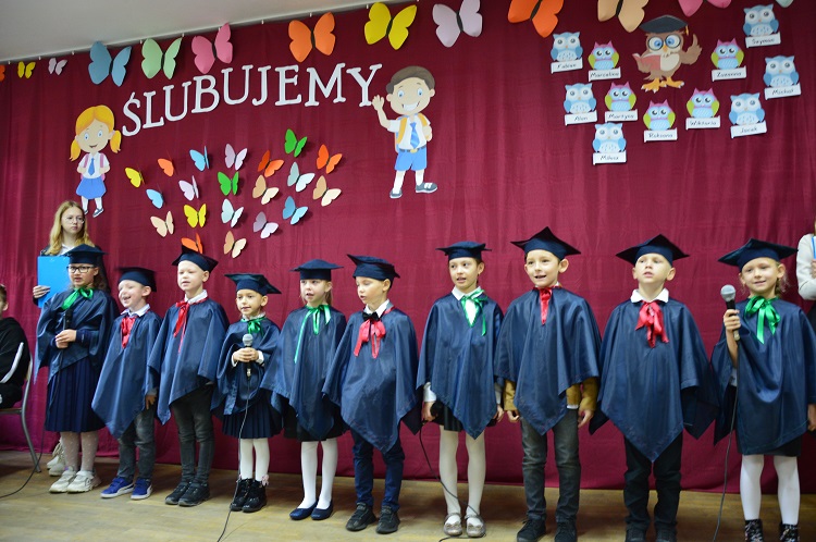 Takimi słowami piosenki uczniowie klasy I przywitali wszystkich na uroczystości Ślubowania. Wśród gości był Wójt Gminy Sławno pan Ryszard Stachowiak, dyrektor szkoły pani Małgorzata Sałusz, zastępca przewodniczącej Rady Rodziców pani Anna Juchniewicz, uczniowie klasy II i III z wychowawczyniami oraz rodzice pierwszoklasistów. Uczniowie klasy I zaprezentowali swoje umiejętności recytatorskie oraz wokalne, aby można było uznać, że są gotowi do przyjęcia do szkolnej braci. Oficjalna część uroczystości rozpoczęła się od przedstawienia młodszym uczniom postać patrona naszej szkoły – generała Augusta Emila Fieldorfa ps. ,,Nil” – bohatera i obrońcę Ojczyzny, żołnierza najwyższej wartości moralnej. Uczniowie klasy I złożyli ślubowanie, a po nich swoje ślubowanie złożyli ich rodzice. Pani dyrektor, ogromnym kluczem do wiedzy, pasowała każdego na ucznia oraz wręczyła pamiątkowe dyplomy Pasowania na ucznia. Rodzice, dumni ze swoich pociech, podarowali dzieciom medale oraz słodycze. Pan Wójt obdarował pierwszoklasistów licznymi grami dydaktycznymi.