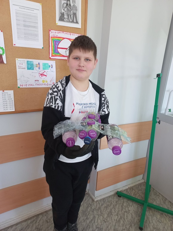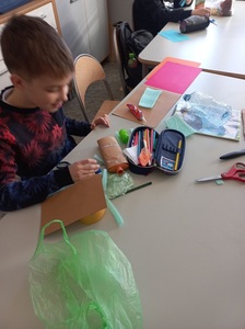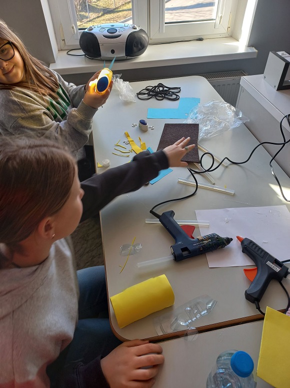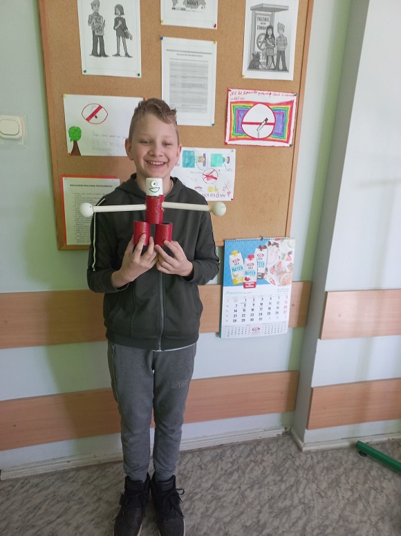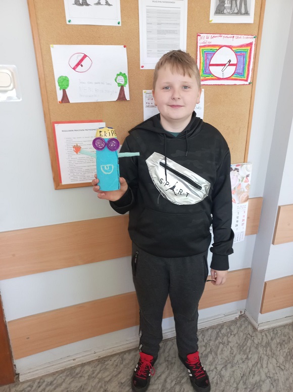 W ramach lekcji techniki ,,Świat tworzyw sztucznych. Recykling" uczniowie klasy V wykonali zabawki z plastikowych butelek, nakrętek oraz innych tworzyw.