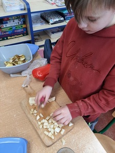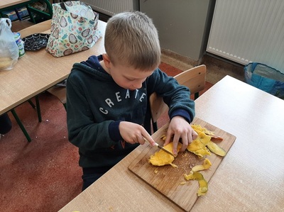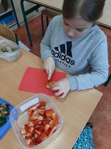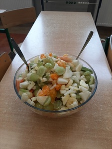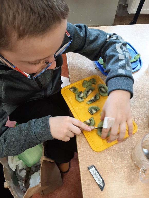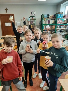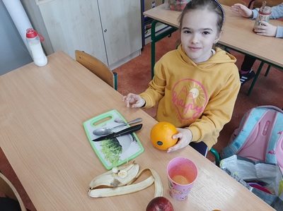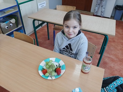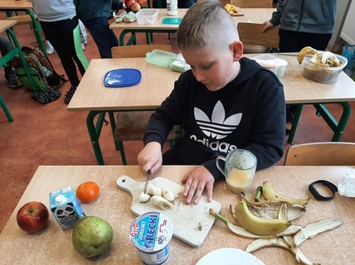 W ramach zajęć promujących zdrowy styl życia, uczniowie klasy II wykonywali kanapki z warzywami, koktajle owocowe i sałatkę owocową.