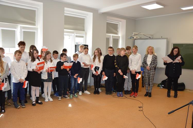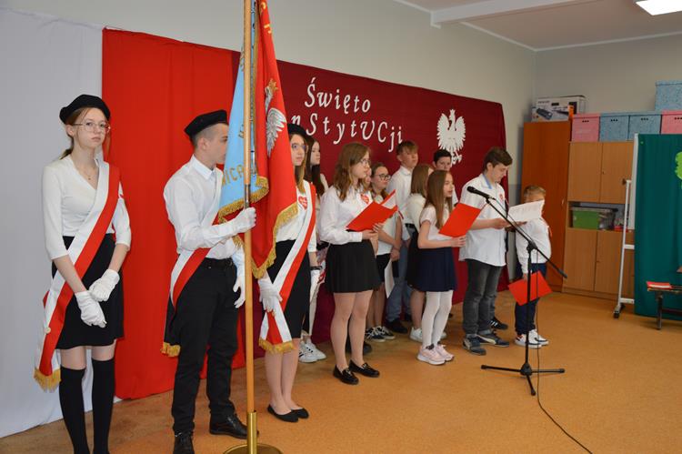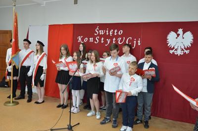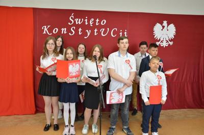 Dnia 28.04.2023r. w naszej szkole odbyła się uroczysta akademia z okazji Święta Konstytucji 3 Maja. Podczas uroczystości uczniowie recytowali wiersze i śpiewali pieśni patriotyczne poświęcone temu historycznemu wydarzeniu. Społeczność szkolna uhonorowała ten dzień galowymi strojami, kotylionami i biało-czerwonymi chorągiewkami.