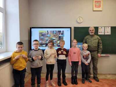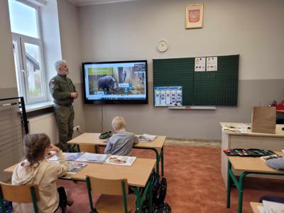 Pierwszoklasiści rozmawiali z leśnikiem o tym, jak przyroda szykuje się do zimy. Dzieci usłyszały wiele ciekawostek z życia leśnych zwierząt.