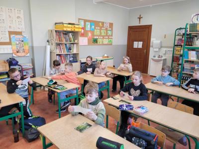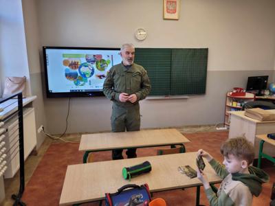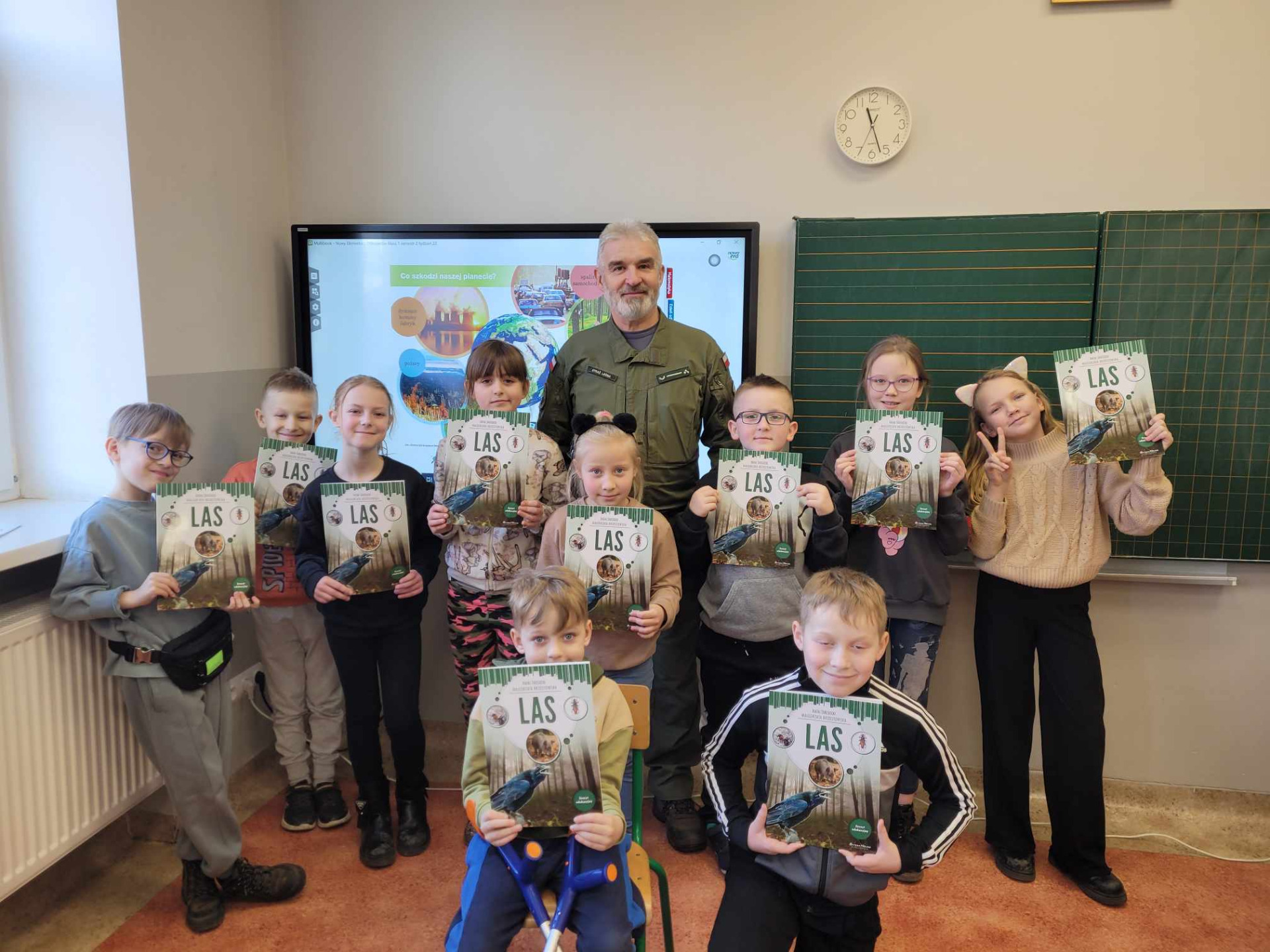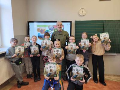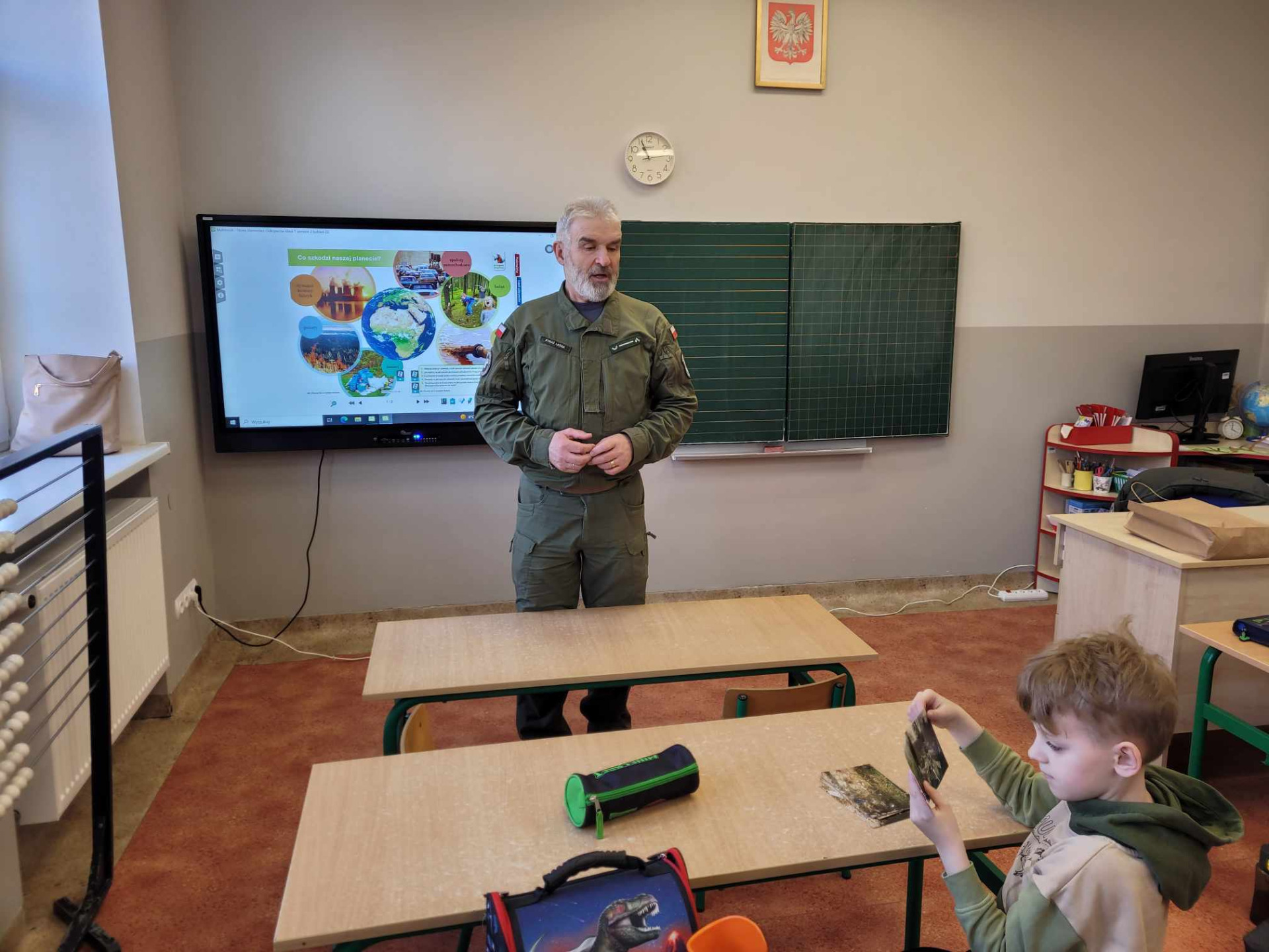 Na kolejnej lekcji z leśnikiem, dzieci przypomniały zasady właściwego zachowania się w lesie. Rozmawiały o niszczycielskiej działalności człowieka oraz o tym, co szkodzi przyrodzie.