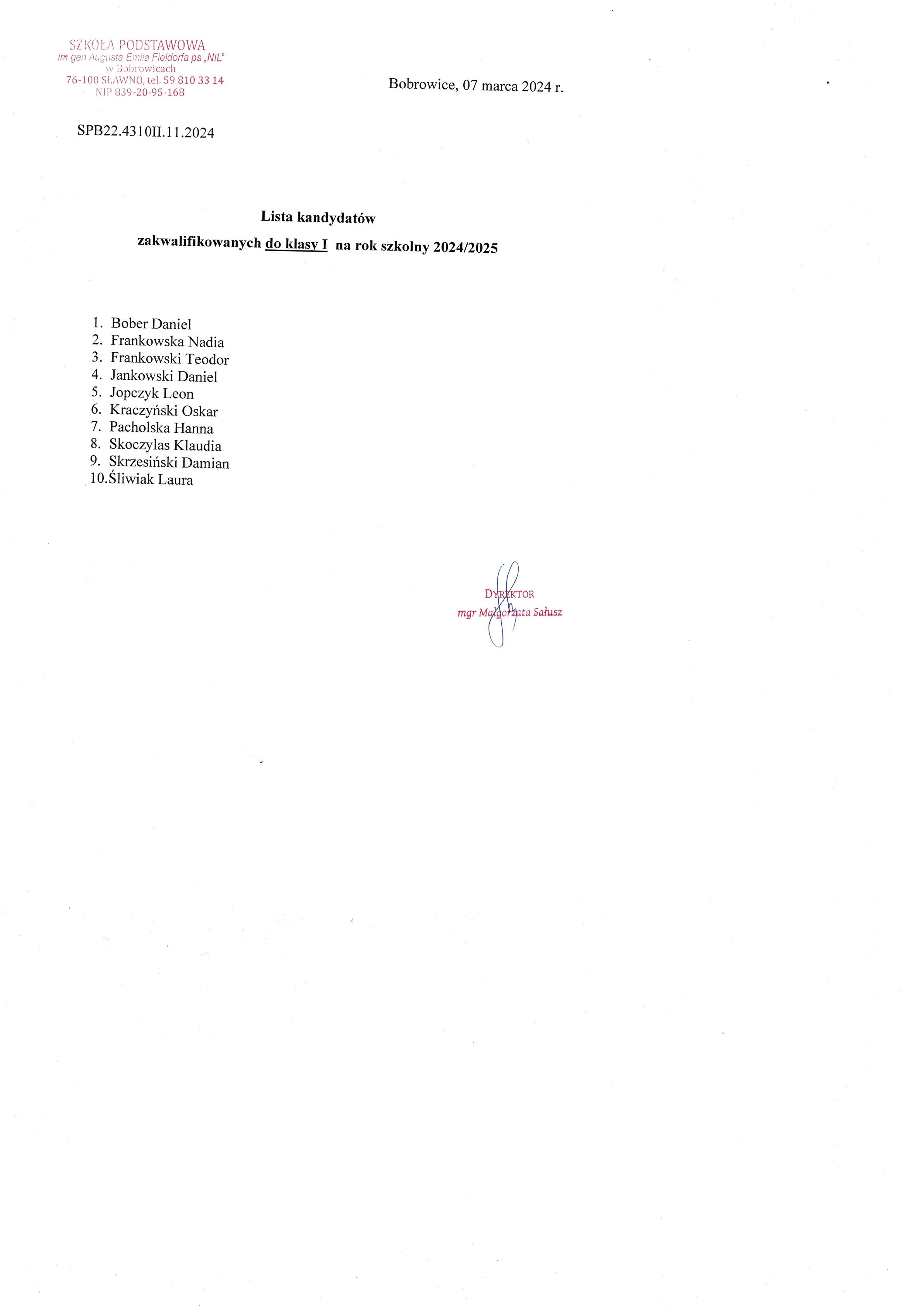 Lista kandydatów zakwalifikowanych do klasy I na rok szkolny 2024/2025 Dyrektor Szkoły Podstawowej im. gen. A. E. Fieldorfa ps. ,,Nil" podaje do publicznej wiadomości listę kandydatów zakwalifikowanych do klasy I na rok szkolny 2024/2025 Zdjęcia Załączniki Lista zakwalifikowanych [207.50 kB] Zobacz również Dzień Pamięci Żołnierzy Wyklętych Lekcja z leśnikiem Przedszkolaki w bibliotece Lista kandydatów zakwalifikowanych do klasy I... Wyjazd do Teatru Muzycznego w Gdyni Lista kandydatów przyjętych do klasy I na rok... 07 marca 2024 Aktualności Wydrukuj Udostępnij Wyświetlono: 132