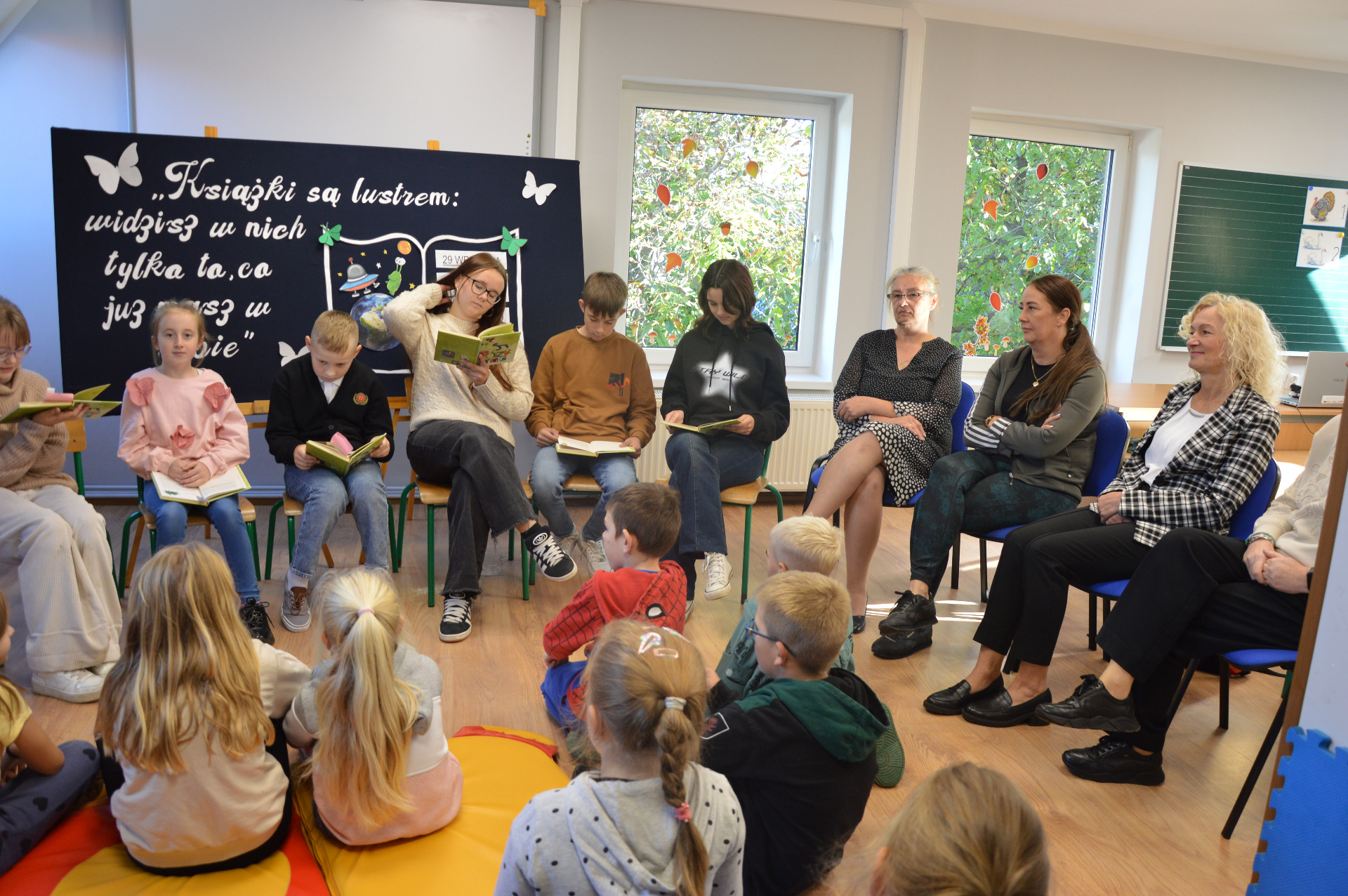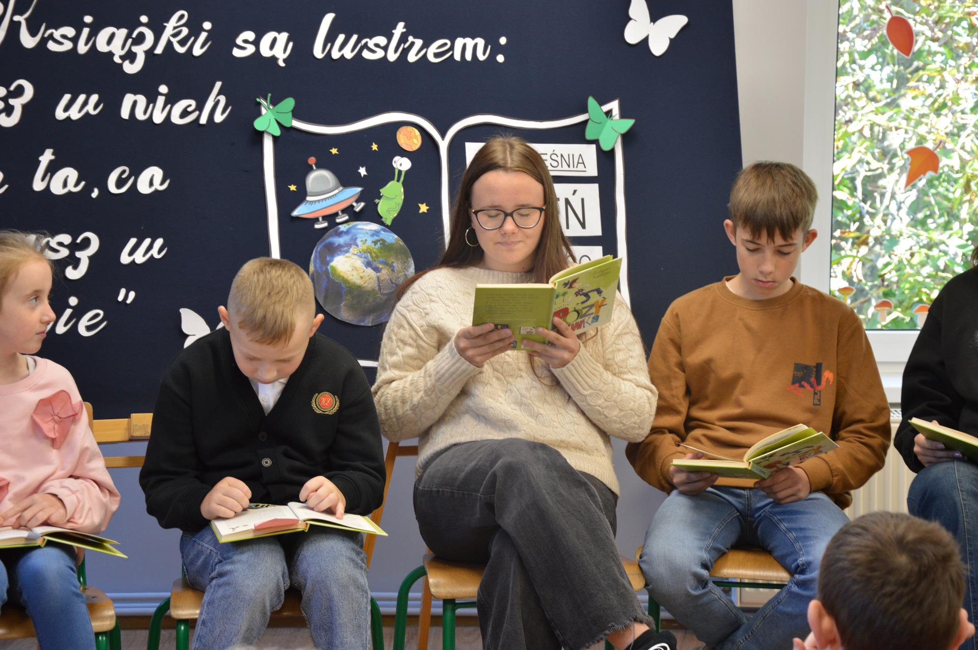 Ogólnopolski Dzień Głośnego Czytania obchodzony jest 29 września. W naszej szkole zorganizowaliśmy to wydarzenie w poniedziałek 30.09.2024r. W ramach obchodów uczniowie z klasy ósmej oraz z klasy trzeciej zaprezentowali fragmenty lektury "Detektyw Pozytywka". W wydarzeniu uczestniczyli uczniowie klas 1-3, a swoją obecnością zaszczyciło nas również szanowne Grono Pedagogiczne na czele z Panią Dyrektor. Młodszym uczniom szczególnie przypadło do gustu rozwiązywanie zagadek, które wynikały z przeczytanych fragmentów. Była to doskonała okazja do promocji czytelnictwa i rozwijania wyobraźni.