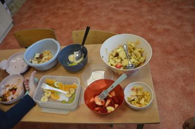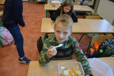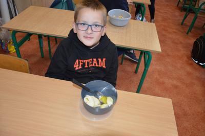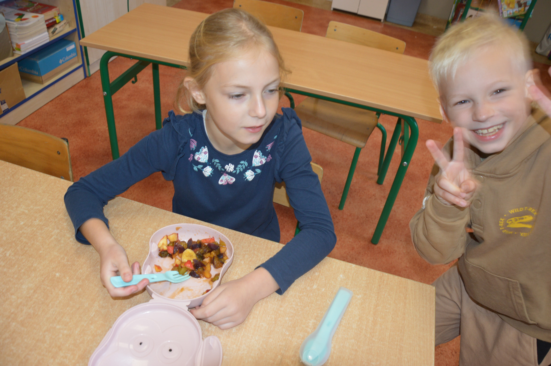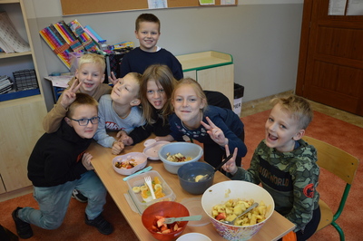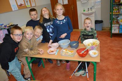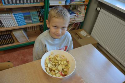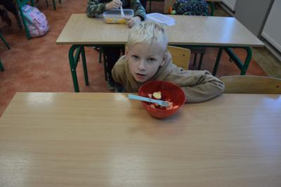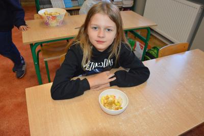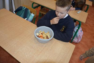 We wtorek 1 października uczniowie klasy II przygotowali na drugie śniadanie sałatkę owocową. Dzieci miały dowolność w doborze składników i dzięki temu ich smak był niepowtarzalny, a przygotowane śniadanie zjadły z apetytem. Sałatki owocowe dostarczają organizmowi wiele witamin, dlatego na stałe zagoszczą w menu dugoklasistów.