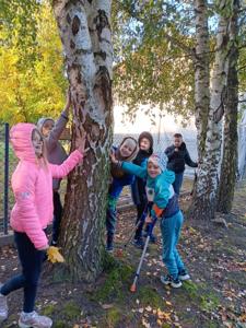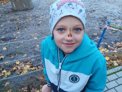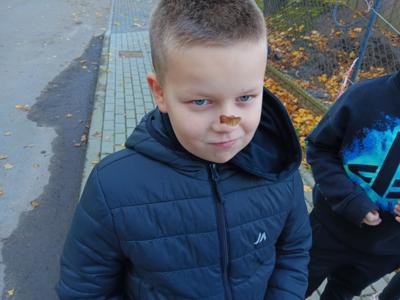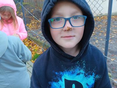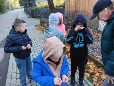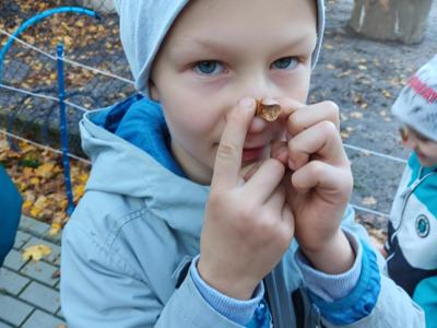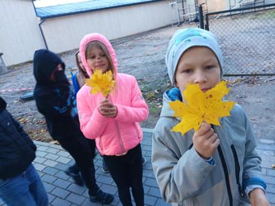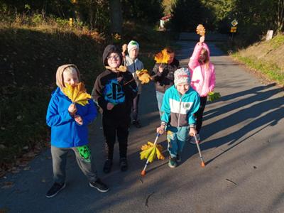 Jesienny spacer uczniów klasy drugiej. Drzewa w jesiennej szacie zapraszały do podziwiania różnobarwnych liści. Dzieci w czasie spaceru wykazały się znajomością gatunków drzew liściastych, ich liści i owoców. Po powrocie klasowy kącik przyrody wzbogacił się w dary jesieni.