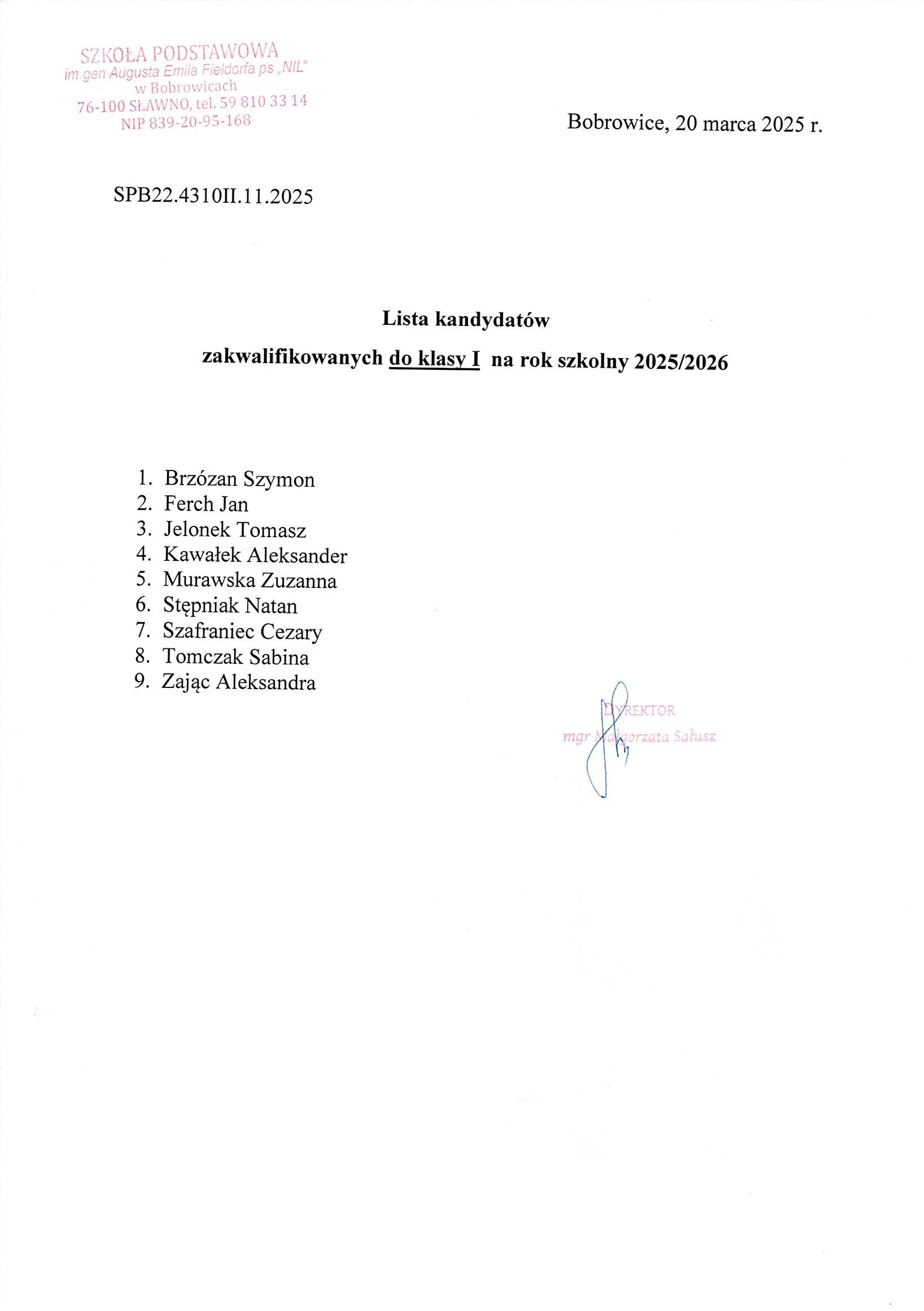 Lista kandydatów zakwalifikowanych do klasy I na rok szkolny 2025/2026 Dyrektor Szkoły Podstawowej im. gen. A. E. Fieldorfa ps. ,,Nil" podaje do publicznej wiadomości listę kandydatów zakwalifikowanych do klasy I na rok szkolny 2025/2026 Zdjęcia Załączniki Lista kandydatów zakwalifikowanych do klasy I [124.01 kB] Zobacz również Dzień Liczby Pi Dzień Św. Patryka w klasach II-III Światowy Dzień Recyklingu w klasie III Lista kandydatów zakwalifikowanych do klasy I... Pierwszy Dzień Wiosny pełen atrakcji! 🌸🎨🎬 Little Leprechaun 20 marca 2025 Aktualności Wydrukuj Udostępnij Wyświetlono: 94