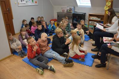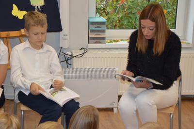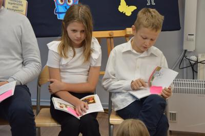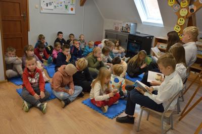 Z tej okazji uczniowie ze starszych klas wcielili się w role lektorów i odwiedzili swoich młodszych kolegów z klas 1–3, aby przeczytać im fragmenty zabawnej i lubianej książki pt. „Cukierku, Ty łobuzie!” autorstwa Waldemara Cichonia. Mali słuchacze z wielkim zainteresowaniem śledzili przygody niesfornego kota Cukierka, a wspólne czytanie stało się okazją do uśmiechu i rozmów o książkach.