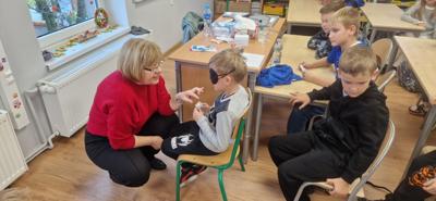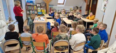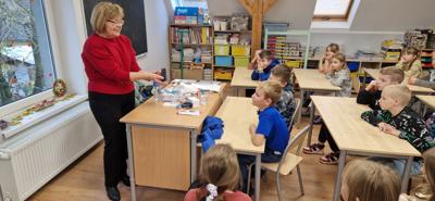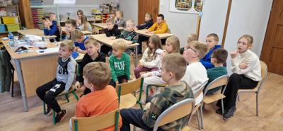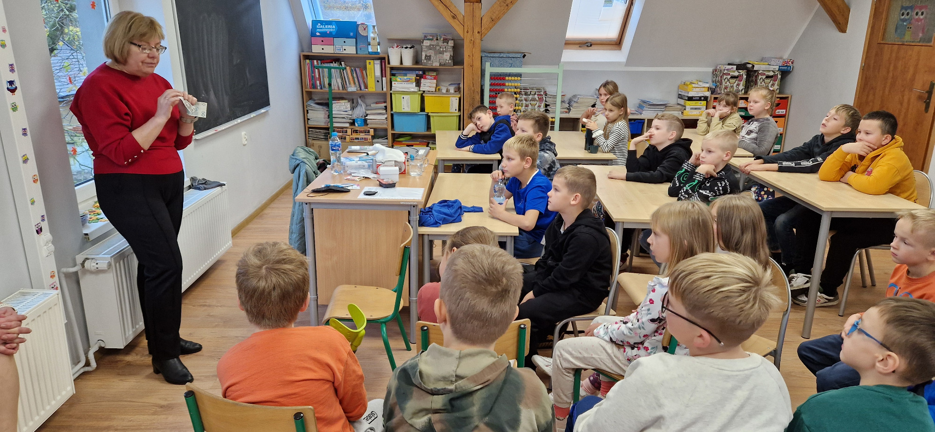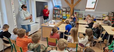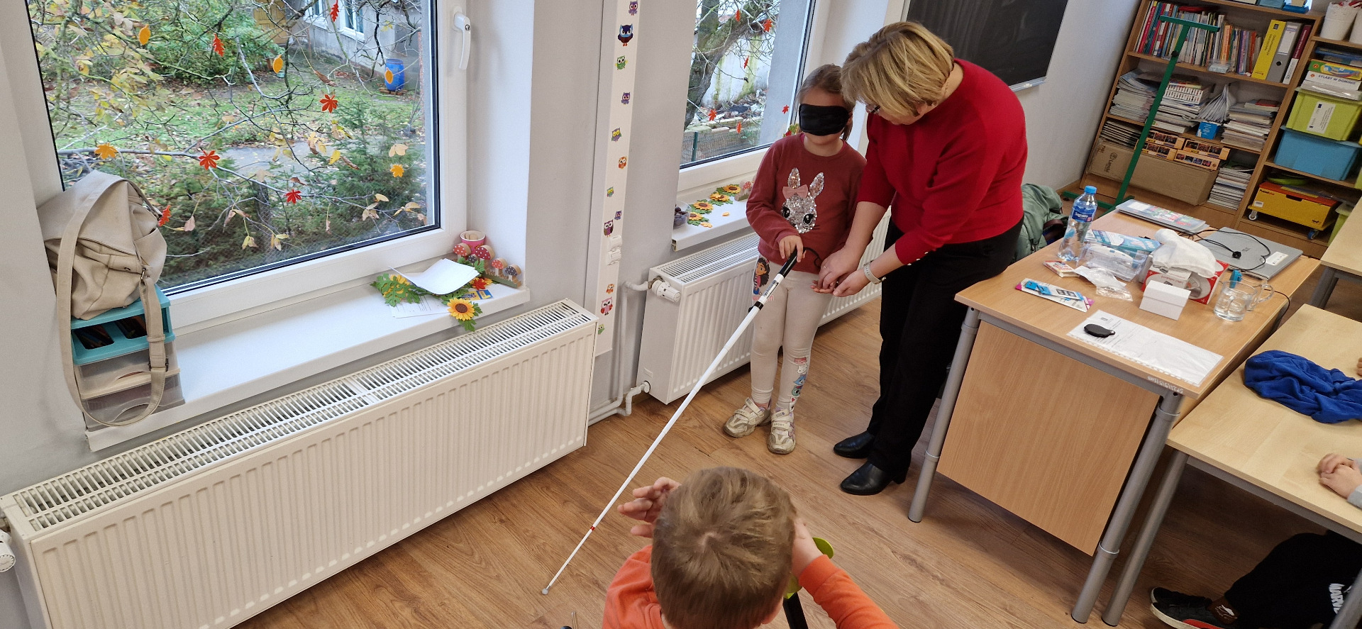 Podczas spotkania Pani Prezes zaprezentowała różne rekwizyty używane przez osoby niewidome, takie jak biała laska, mówiący zegarek czy termometr. Uczniowie mieli okazję dowiedzieć się, jak wygląda życie osób niewidomych i jakimi zmysłami posługują się na co dzień.