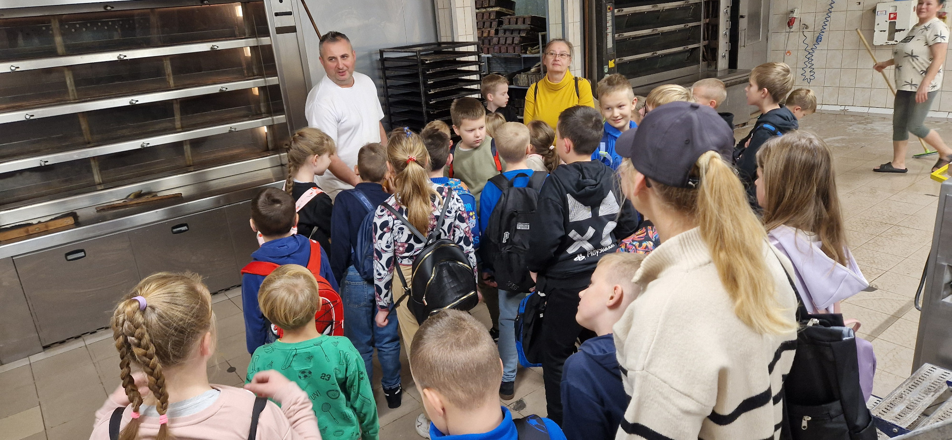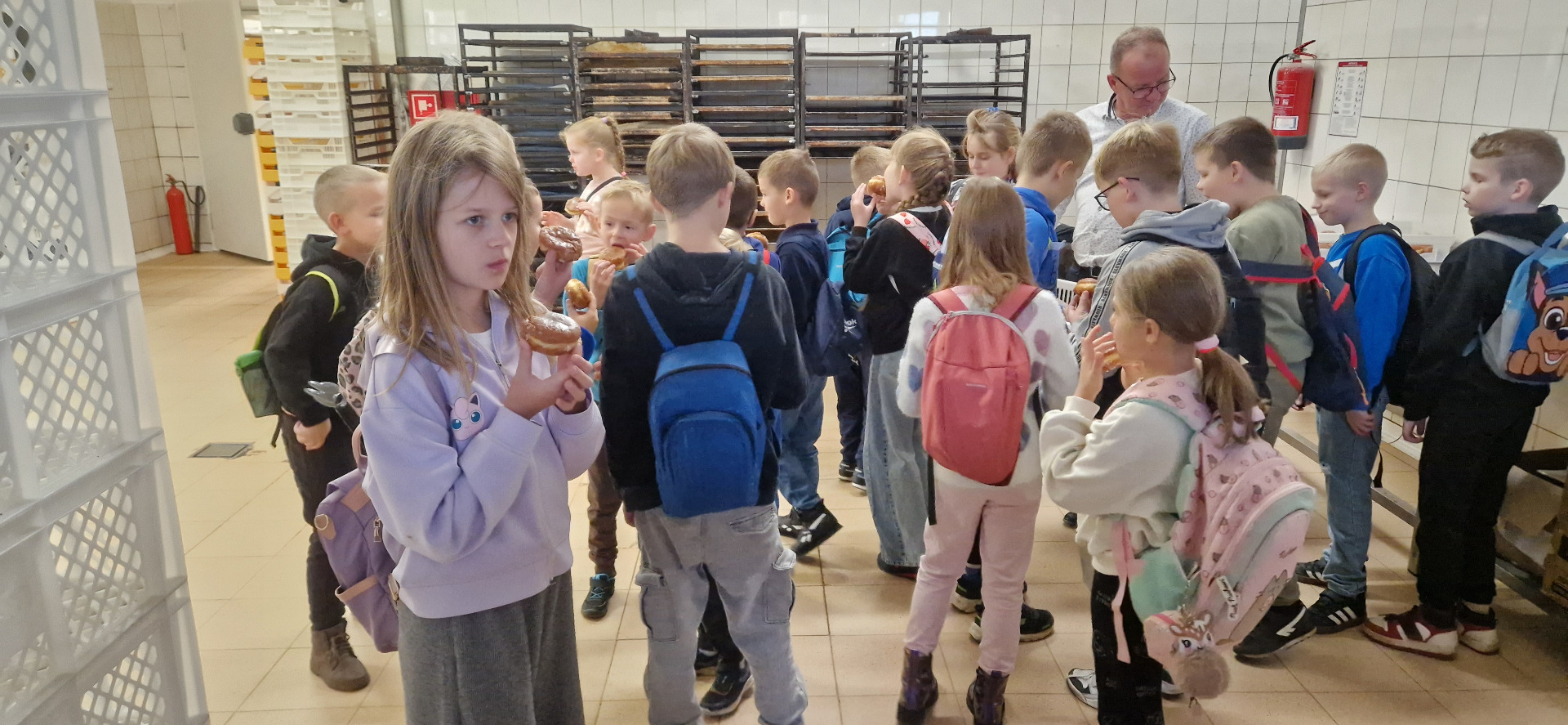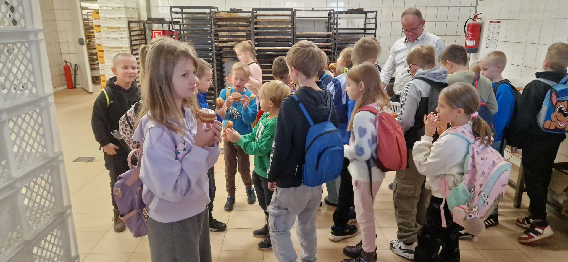 W dniu 06.11.2025r. uczniowie klas I-III odwiedzili piekarnię PSS Społem w Sławnie. Celem wycieczki było poznanie tajników pieczywa oraz pracy piekarza. Podczas wizyty dzieci miały okazję zobaczyć jak powstaje proces powstawania chleba- od przygotowania ciasta, poprzez formowanie bochenków, aż po ich wypiek w dużych piecach. Zobaczyli również jak powstają rogale świętomarcińskie, a także mieli okazję pomóc w przygotowaniu piernika z marmoladą. Na koniec wizyty wszyscy zajadali się pysznymi pączkami wypieczonymi w piekarni. Następnie uczniowie wyruszyli do ,,Kina pod Filarami’’, gdzie z zaciekawieniem obejrzeli film pt. ,, Super pies i kot łotr’’.