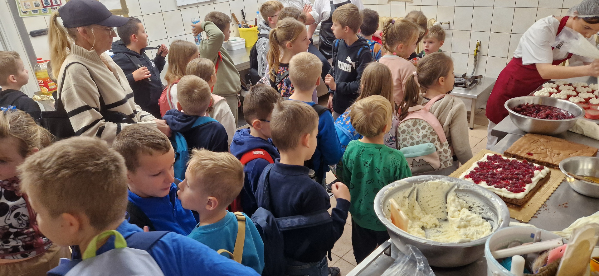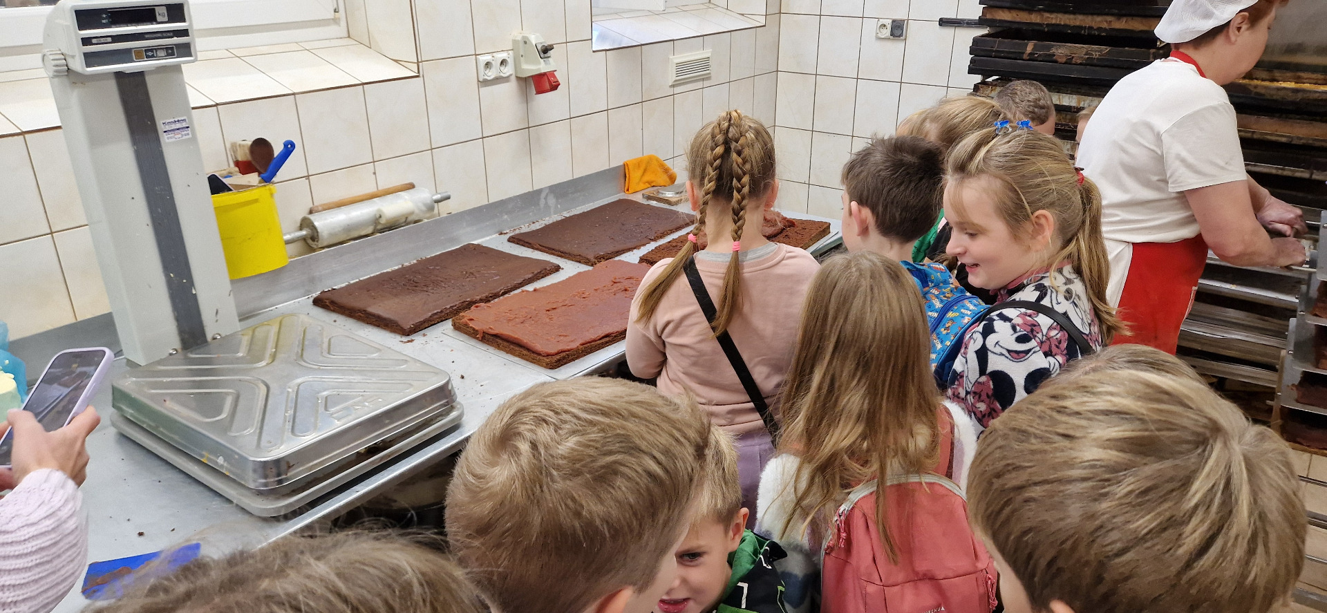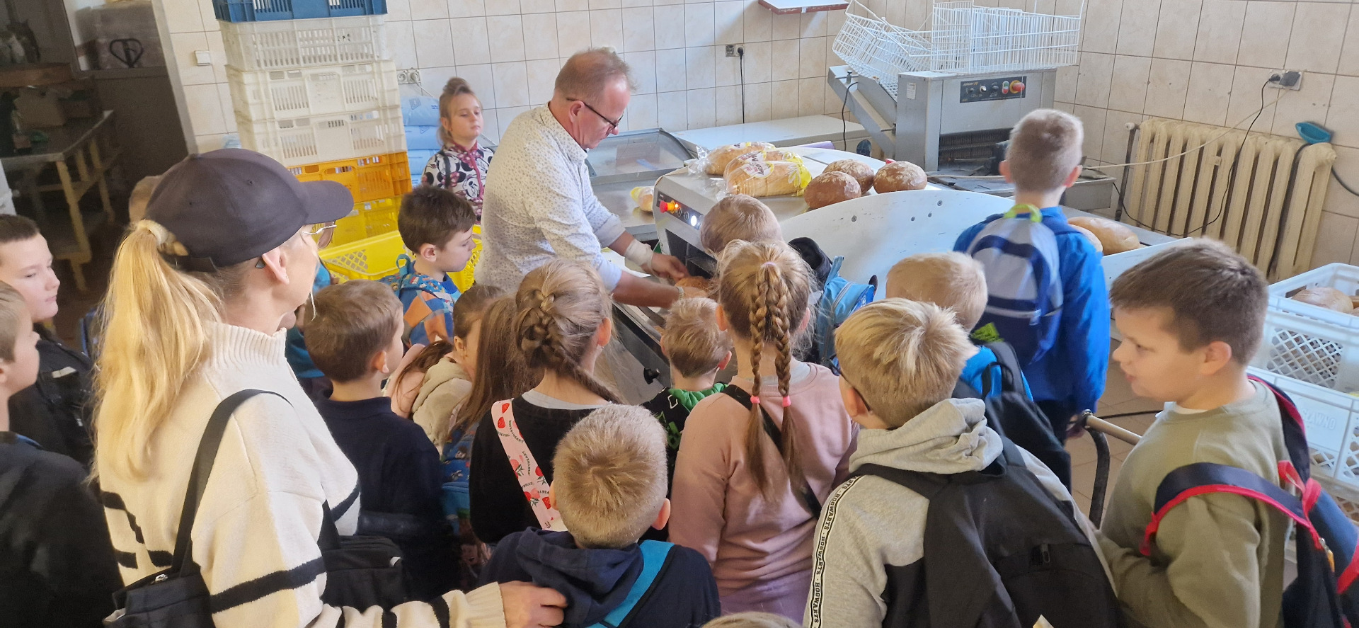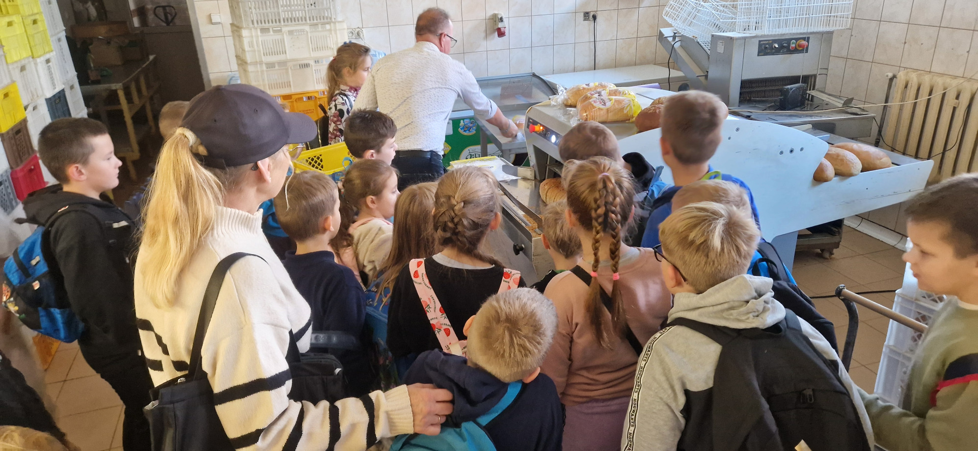 W dniu 06.11.2025r. uczniowie klas I-III odwiedzili piekarnię PSS Społem w Sławnie. Celem wycieczki było poznanie tajników pieczywa oraz pracy piekarza. Podczas wizyty dzieci miały okazję zobaczyć jak powstaje proces powstawania chleba- od przygotowania ciasta, poprzez formowanie bochenków, aż po ich wypiek w dużych piecach. Zobaczyli również jak powstają rogale świętomarcińskie, a także mieli okazję pomóc w przygotowaniu piernika z marmoladą. Na koniec wizyty wszyscy zajadali się pysznymi pączkami wypieczonymi w piekarni. Następnie uczniowie wyruszyli do ,,Kina pod Filarami’’, gdzie z zaciekawieniem obejrzeli film pt. ,, Super pies i kot łotr’’.