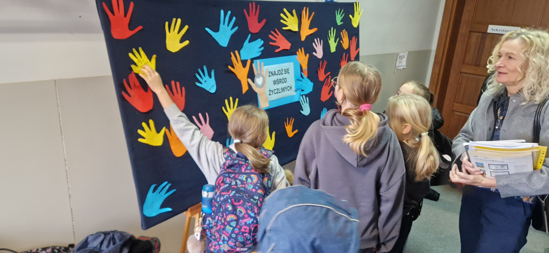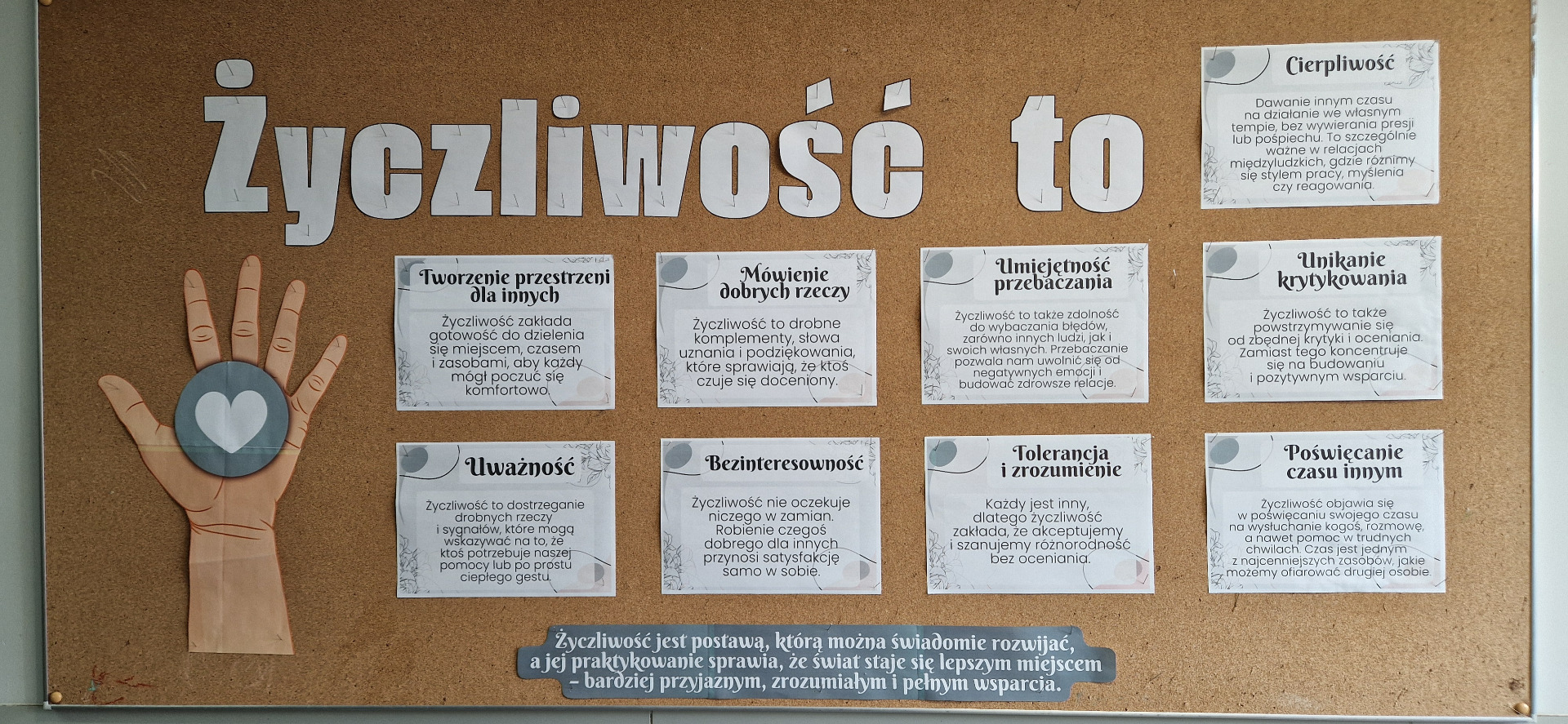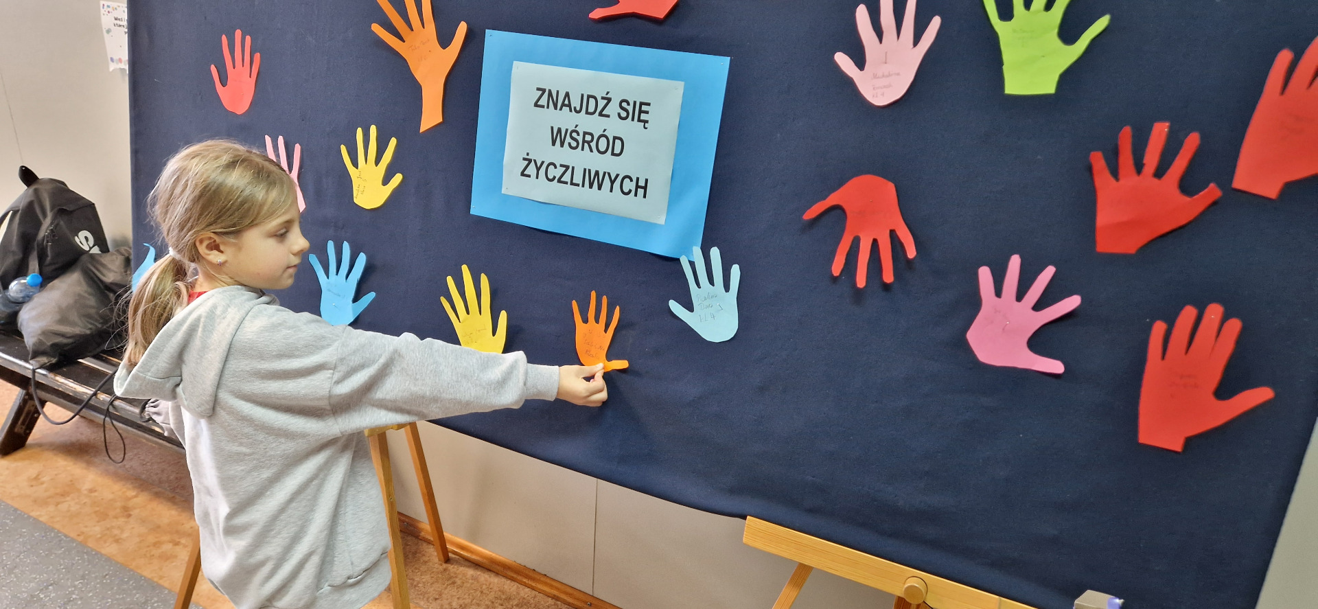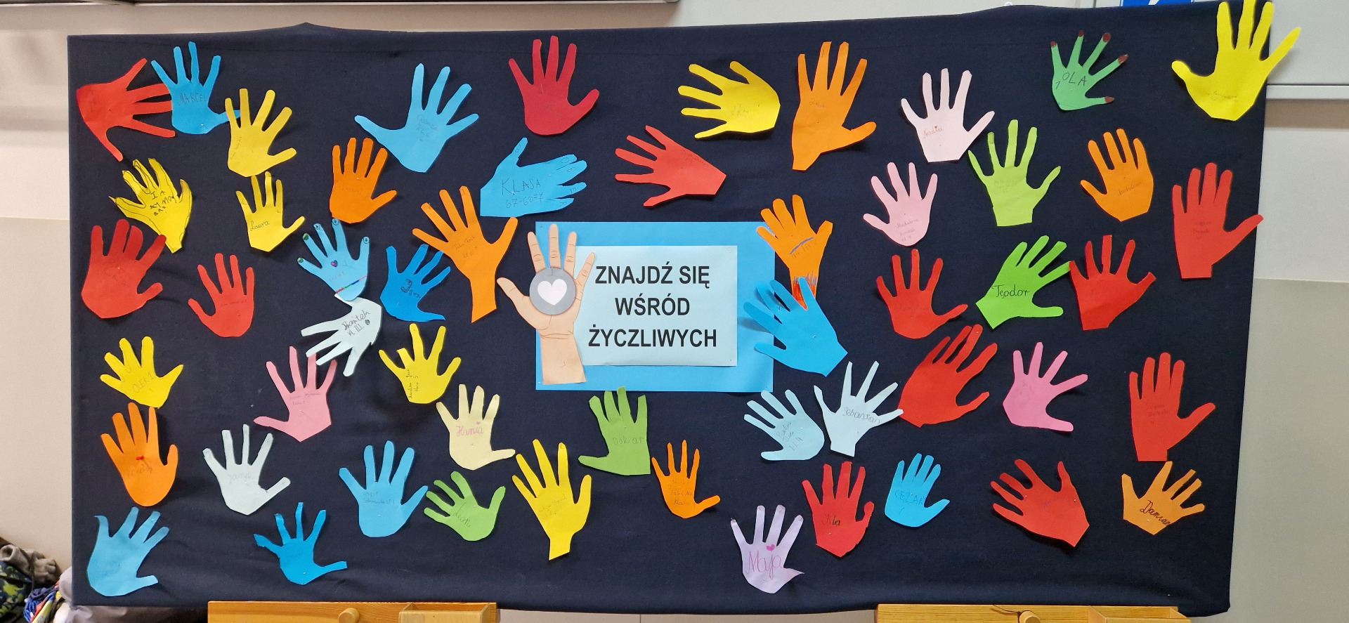 Największym przedsięwzięciem była jednak wielka tablica życzliwości, którą wspólnie stworzyli nasi uczniowie. Każdy z nich odrysował swoją dłoń, wyciął ją, a następnie przypiął na tablicy, tworząc kolorową mozaikę pełną pozytywnej energii.